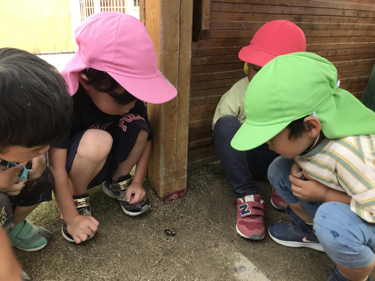 園庭にでると、砂の上にいる虫を見つけて「セミかな?」「何セミだろう?」と会話をしながらセミが生きているのか恐る恐る手を伸ばし確認する様子がありました。しばらく観察していたのですが、動かないことに気が付くと、大きい子が「お墓作ろう」と砂を掛けている姿がありました。