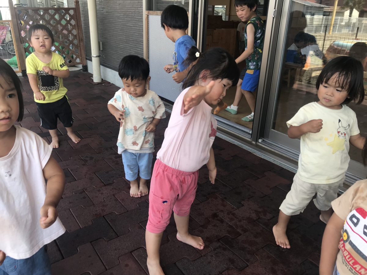 今日はテラスで遊びました。テラスにて音楽を流し、ダンスを踊りました。最近は「カイリキーサーキットトレーニング」の他にも「無責任でええじゃないかlove」という曲でもダンスを踊っていて、流すと「もっかいー!」「いー!」「これすきー!」と言いながら、ノリノリのサビに合せて踊り出す姿がとても可愛らしいです。りんご組のお友だちがノリノリで踊っているといちご組のお友だちも楽しくなってくるようで体全体で弾みながらリズムを取り、楽しい雰囲気を一緒に味わっている姿がありました。ダンスで体も温まってきていたので、お水をを用意してクールダウン。「きゃー!」「つめたーい!」「きもちー!」と言いながらお水に触る子ども達。その内手の平をスプーンみたいに丸めてお水をすくうと、「えいっ!」と自分の上に目がけてお水を飛ばすと、小さな水の粒がパラパラっと自分にかかり、「きゃーーー!」とまた大興奮!同じ事を何回か繰り返し行っていて、楽しそうにしているのを見て、他のお友だちも真似っこしてお水を飛ばしてみると、お水が頭上から飛んでくるのをみんなで楽しそうに遊んでいました。