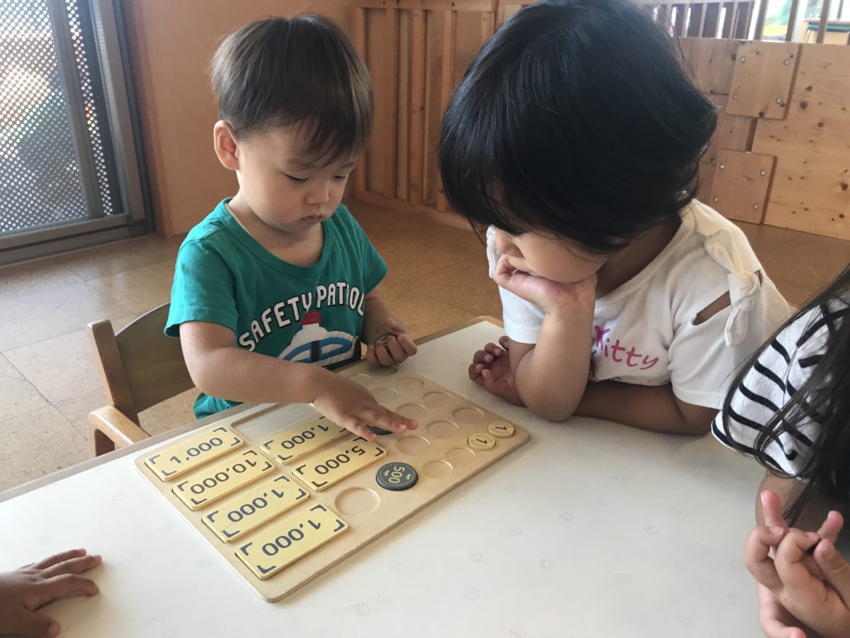 同じ形のコインをどこにハマるか探して入るのを、以上児クラスのお姉さんが見守ってくれていました。