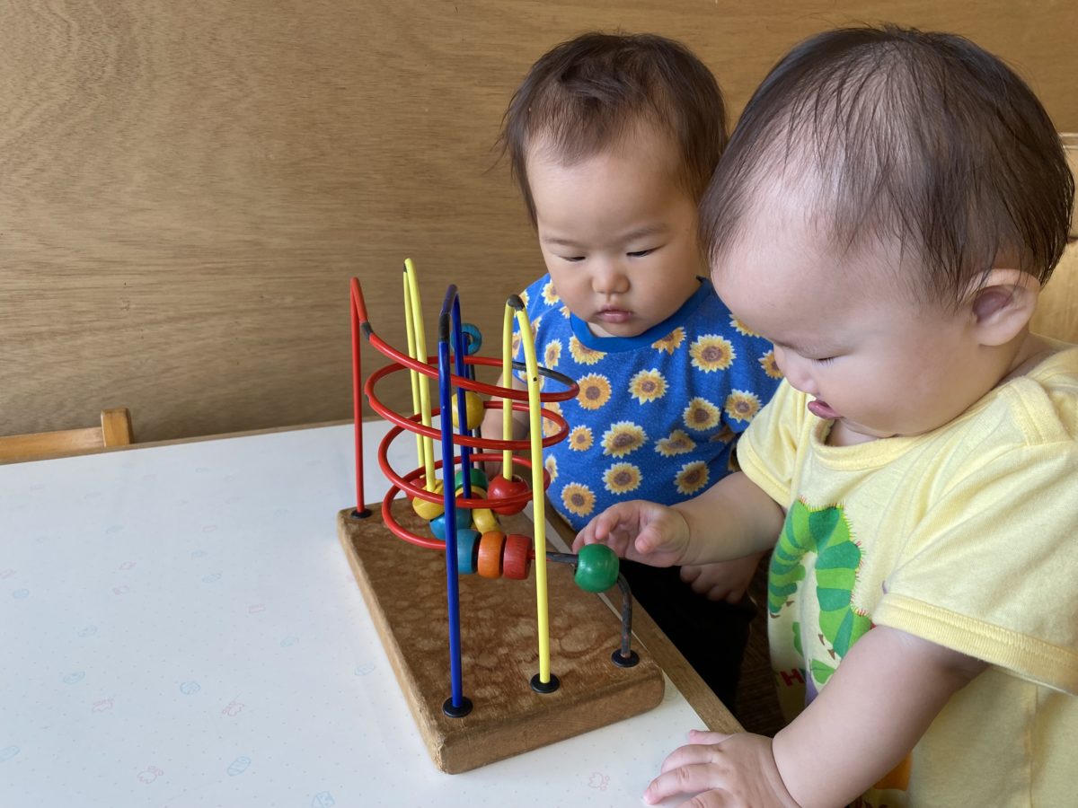 すいか組さんも手指が器用になってきて、ルーピングのコマを一つ一つ指で上手につまんで動かしたりクルクル回したりして感覚を楽しむ姿がありました。