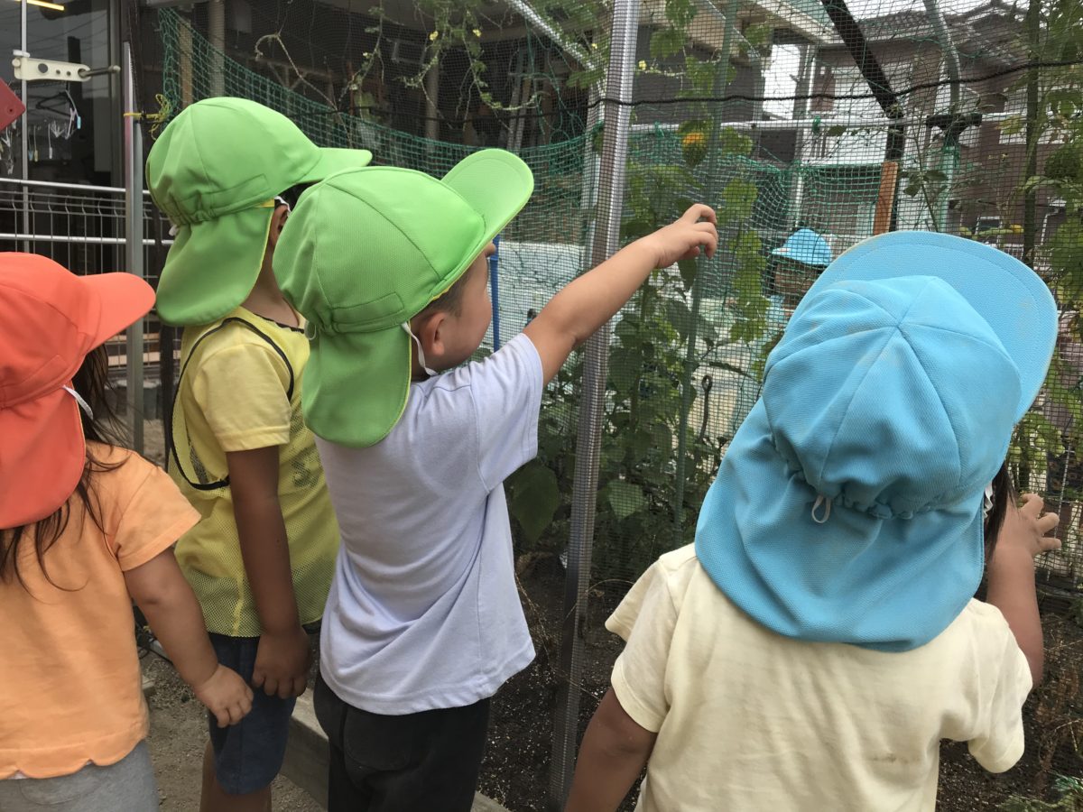 園庭では、畑を見に行くと大きい組のお兄さんが「みて!ここきいろいの!」と黄色になっているゴーヤを教えてくれました。「きいろ?」とみんな興味津々で探して「あ!あった!きいろ!」と大興奮で指さしながら網越しに覗き込んでいました。その後もみんなでトマトを探したり、他の野菜の茎を見たりして楽しんでいました。
