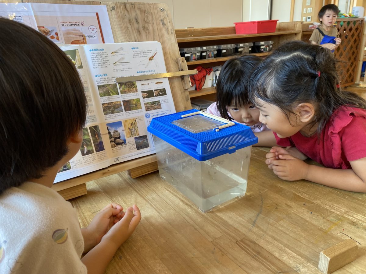 川遊びでヤゴを発見!!お部屋でヤゴの資料と共に飼育ケースに入れてみると「これ、なに!?」「これは、なんになるの!?」と話したり、めろん組さんに聞いていました。