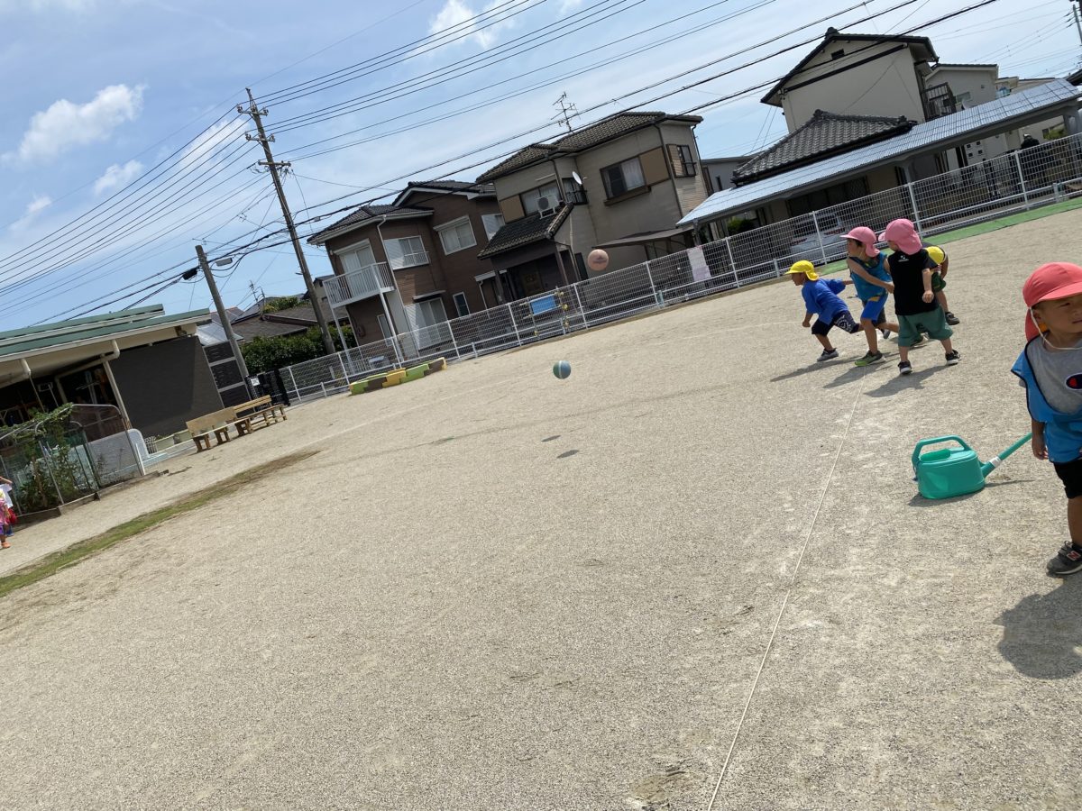 「ボールできょうそうしよう!」と今日はボールを長い距離で投げることができるか引いた線にめがけて力いっぱい投げていました。