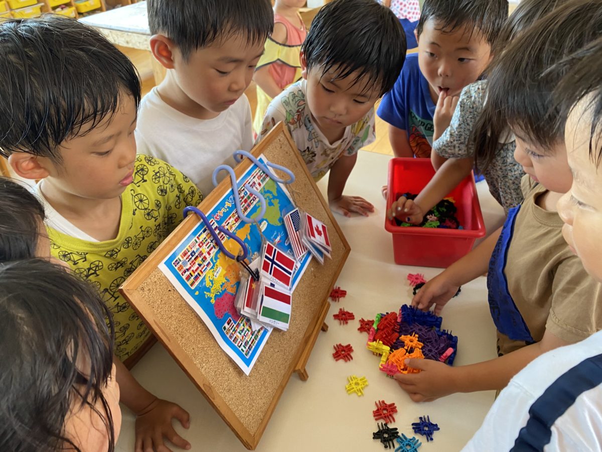 「こんなかたちできたよ!びょういんのマーク!」とブロックで作った作品をお友だちに見せると「こんなこっき、あったよね!?」「どれだっけ!?」とスイスの国旗探しが始まっていました。