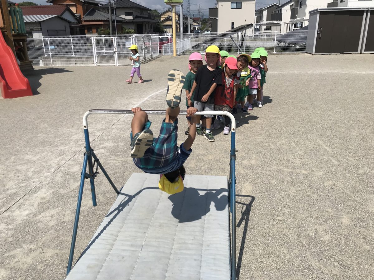 「せーの!」逆上がりに挑戦!!近くにいたお友だちも「もうちょっと!」「がんばれ~」と応援する声も聞こえてきました。