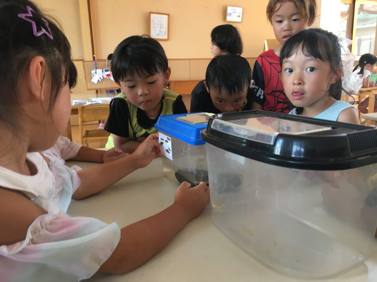 保育室にシオカラトンボが入ってきて捕まることにも成功!! そして以前、川で見つけてヤゴも一緒に置いてみると「あっ!これこのまえのヤゴ。とんぼのあかちゃんやで。」「これがとんぼになるの?」「ぜんぜんすがた、ちがうよねー。」と成虫とは全然違う姿に子どもたちも見比べている様子がありました。