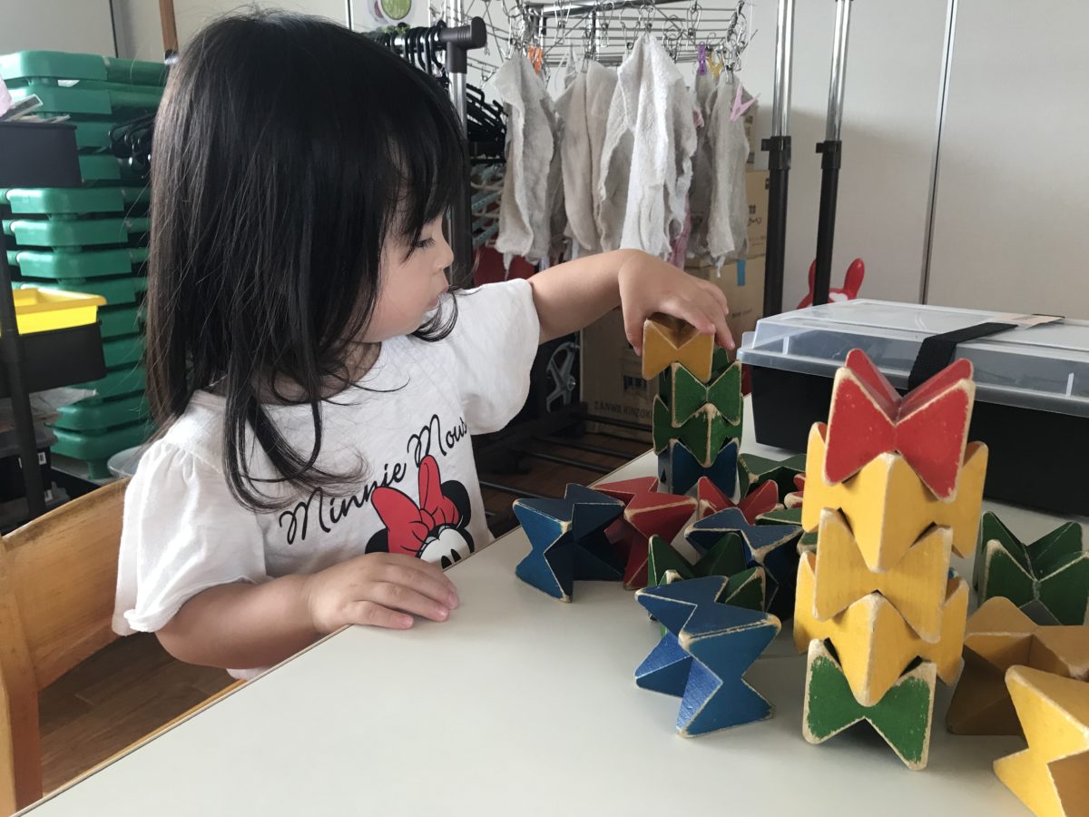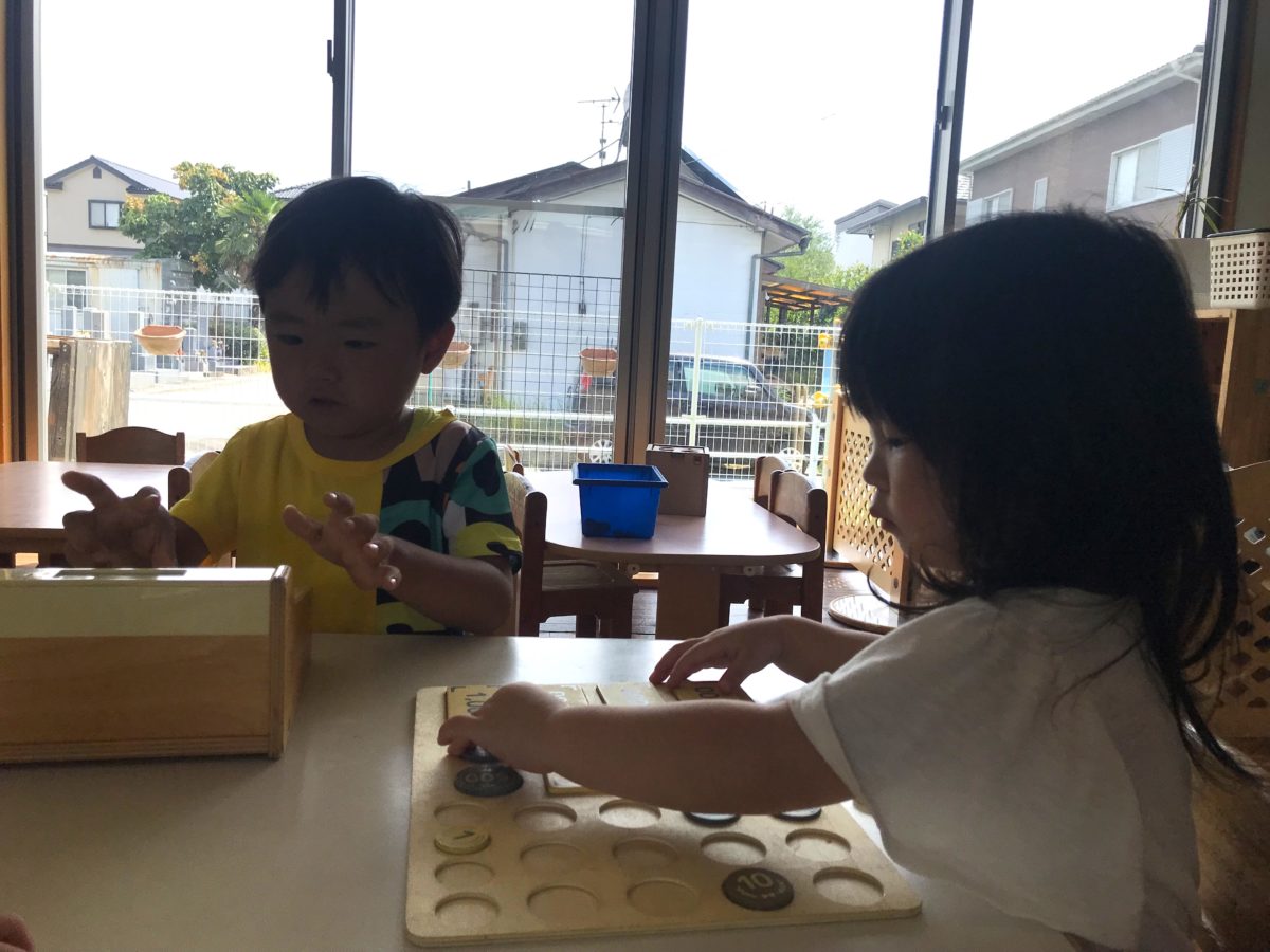一方別の場所では、乗り物に夢中な子どもたち。大きな紙いっぱいに線路や道路、更には自動販売機を描き、その上をバスや電車が通ります。トンネルを立ててみたり、電車を長くつなぎ合わせてみたり「つぎこれかく!」「これつなげて」と会話を楽しみながら元気いっぱい車を走らせる子どもたちでした。