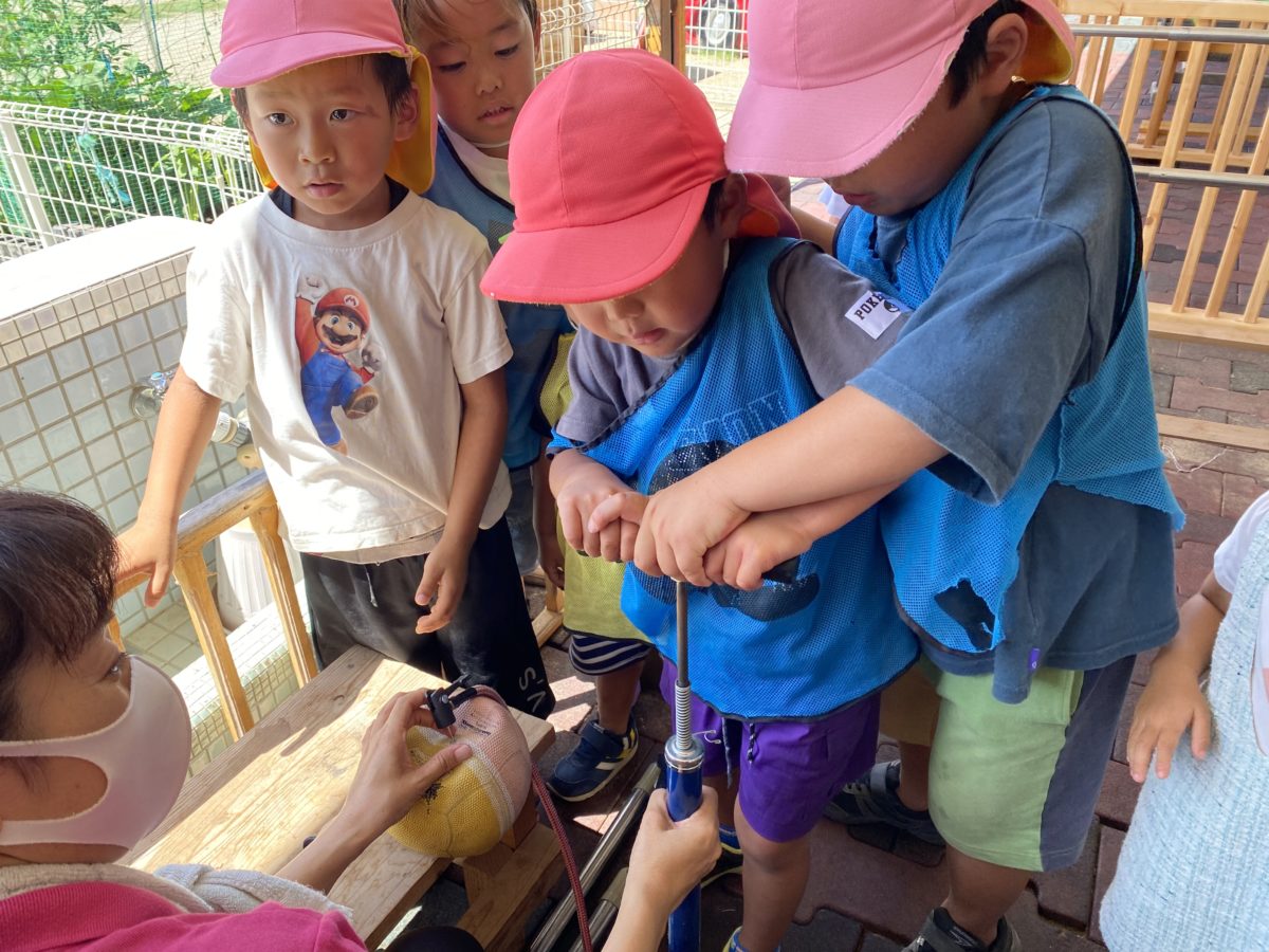 「ぼーる、くうきぬけとる!!」とボールの空気入れに挑戦!!思っていたよりも難しかったようで、力を込めていました。