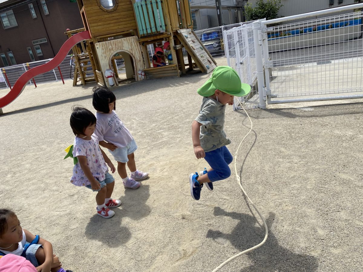 さくらんぼ組さんも大縄跳びに挑戦!!縄を飛び越えようとおもいきりジャンプ!!していました。