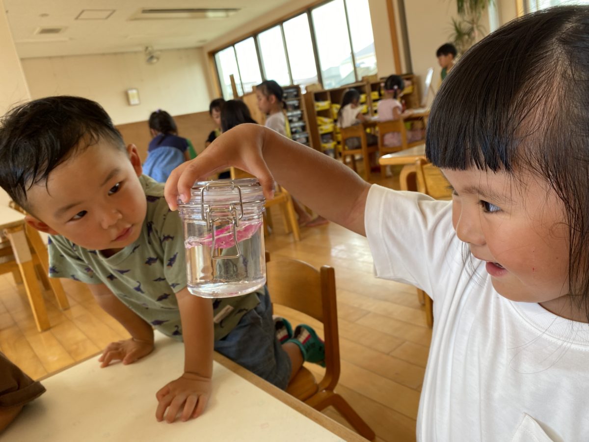 先日の川遊びで見つけた貝殻を入れていたケースに水を入れて観察できるようにしておくと水中で大きく見える貝にびっくり!!「かいがら、おおきくなった!?」とお友だちと一緒に驚き喜びながら観察していました。貝の中の様子まで大きくなったことでよく見えて観察を楽しんでいました。また「かいってすぐおおきくなるんやな。」というかわいいつぶやきも聞こえていました。また川で見つけた魚の資料を用意しておくと「かわで、さかなみつけたよな!」「つかまえれやんだなー」と川の魚をつかまえようと大きな網を用意したことを思い出しながらお友だちと会話を楽しむ姿がありました。また登園時に素敵なお花を見つけたお友だちがお花を水に浮かせておくと「かわいい」「きれい」と喜びながら貝殻はしずんでいますがお花は浮いている様子に気付いて「おはながかさみたい!」と観察を楽しんでいました。