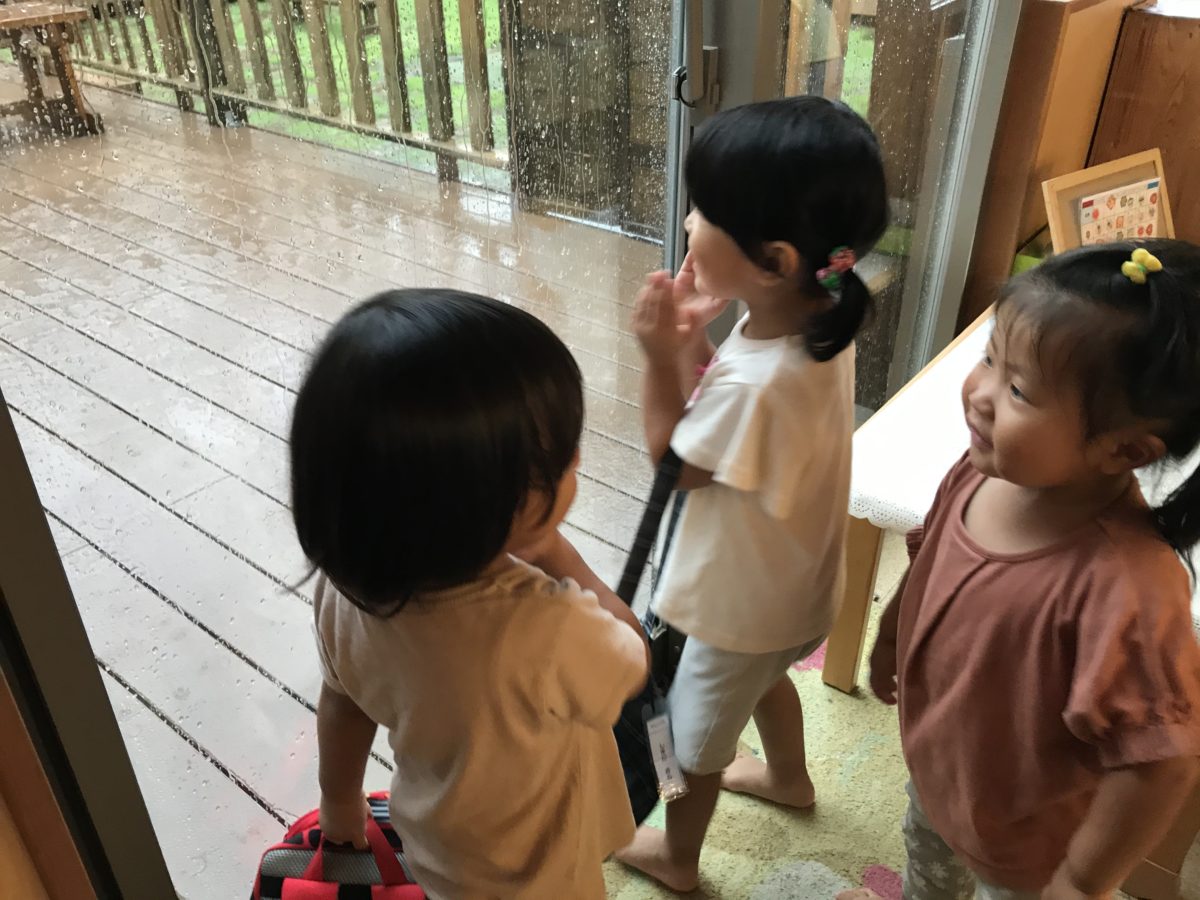 「あめ、たくさあんふってるねぇ」とお話ししながら外を見ていました。窓を触って「つめた!」とお友だちとお話ししていました。