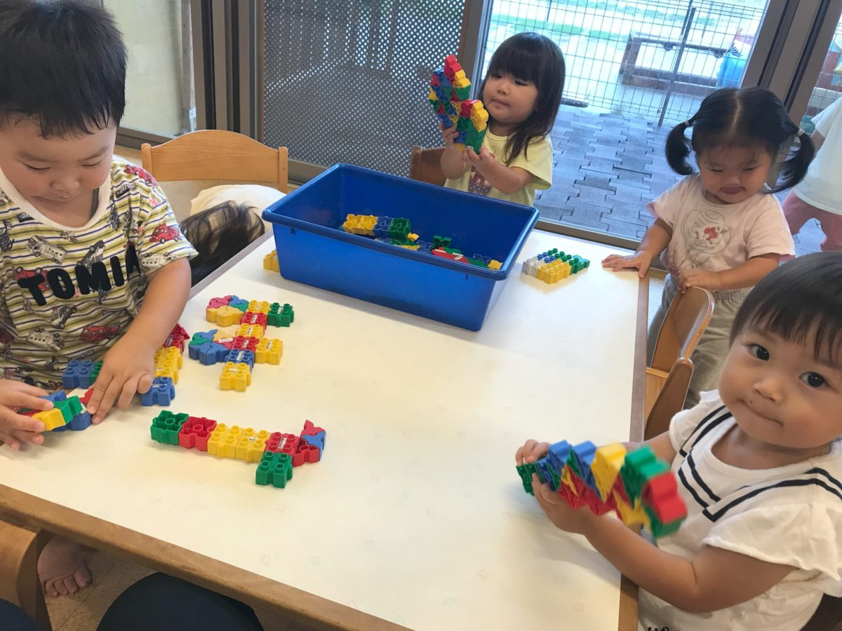 「くしにささってだんご~」とだんご3きょうだいの歌いながらみんなでだんごの形をブロックで作っていました。