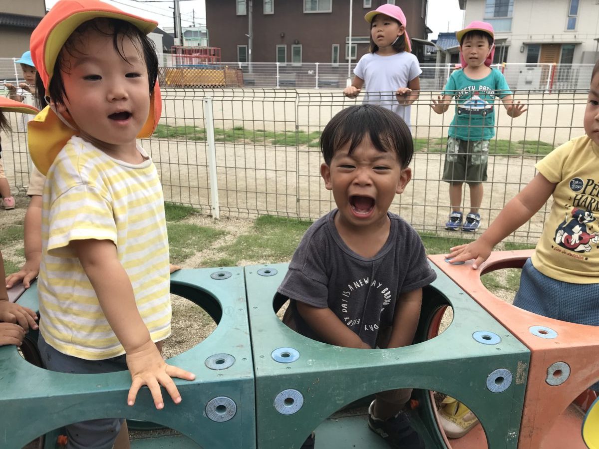 カラーボックスの上に自分たちで乗って立ってみたり座ってみたり。大きい園庭の方で以上児さんがリレーやかけっこをしているの「おーい!」声援を送っていました。