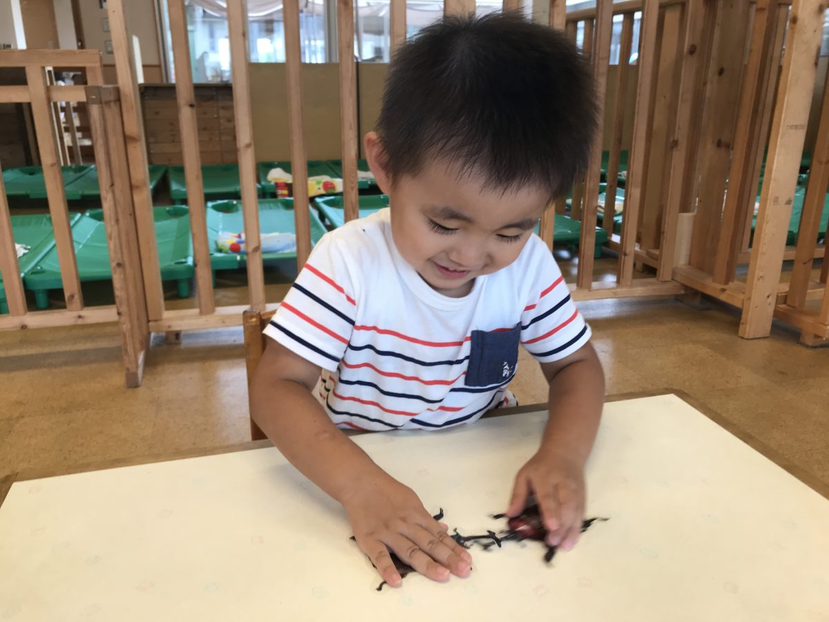 以前見たカブトムシが場所の取り合いをして戦っている姿の写真を思い出したのか、「カブトムシ勝負しとんの。」と言いながら楽しんでいました。