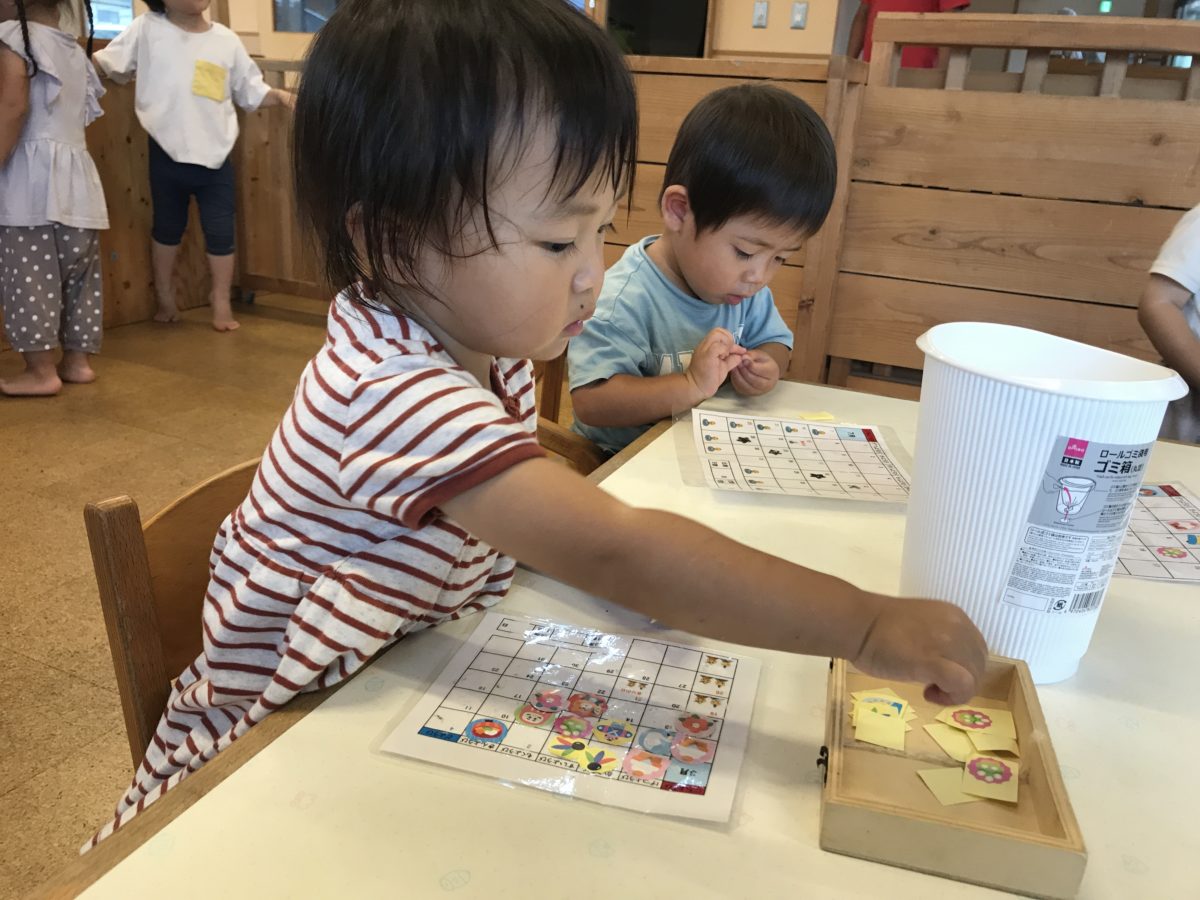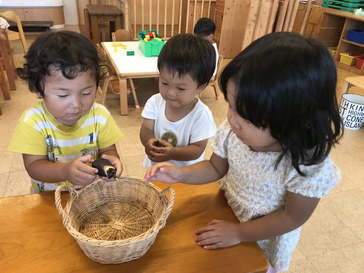 今日は昨日お部屋に飾ってあったお野菜を手に取れるようにカゴに入れて、大型絵本の野菜と果物が載っているページを開けて置いておくと、「なにこれー!」と歓声を上げる子ども達。お野菜が手に取って見られるのが嬉しいようで、お友だちと一緒に触ってみたり、絵本と見比べてみたりしながら、お野菜の観察を楽しみました。置いてあるお野菜が“ナス”と“プチトマト”で、プチトマトは少し強く握ったらつぶれてしまい、それをとても驚いてしまったのか見せにきていました。中からトロッとした種が出てきて、手についたのを物凄く驚いた顔で見せてくれました。お野菜を見て、触ってみて、強く握ったらつぶれてしまうことなども分かったようで、ナスを触るときはそっと触っていました。これからもいろいろなものを触って、観察していきたいと思います。