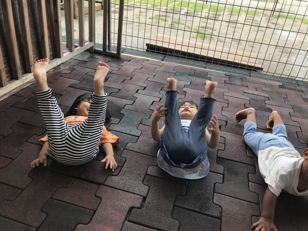 お友だちと一緒にヨガ運動みたいに足を持ち上げるポーズをしていました。みんなでするのがとてもよかったようで、同じポーズのお友だちが5.6人居て楽しそうでした。