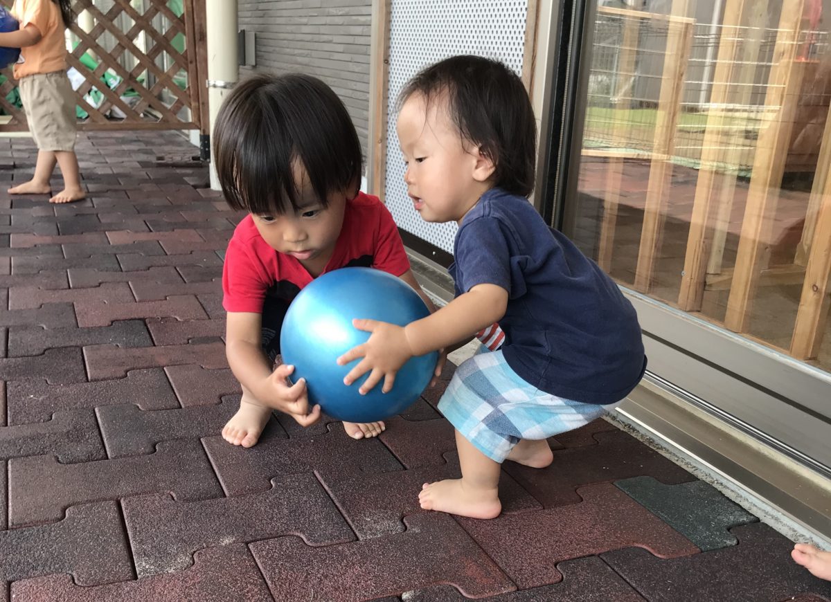 テラスではボールを投げて転がしては拾ってを繰り返しており、お友だちと同じボールを一緒に拾うと少し驚きながらもとても嬉しそうでした。また、座ってボールをポンポンと叩いて弾む感覚を楽しむお友達の姿があり、それを真似して他のお友だちもお気に入りのボールを持ってきて隣に座り真似して嬉しそうに顔を見合わせていました。一緒に遊んだり真似し合ったり、お友だちと関わることでさらに楽しそうに遊ぶ姿が見られました。