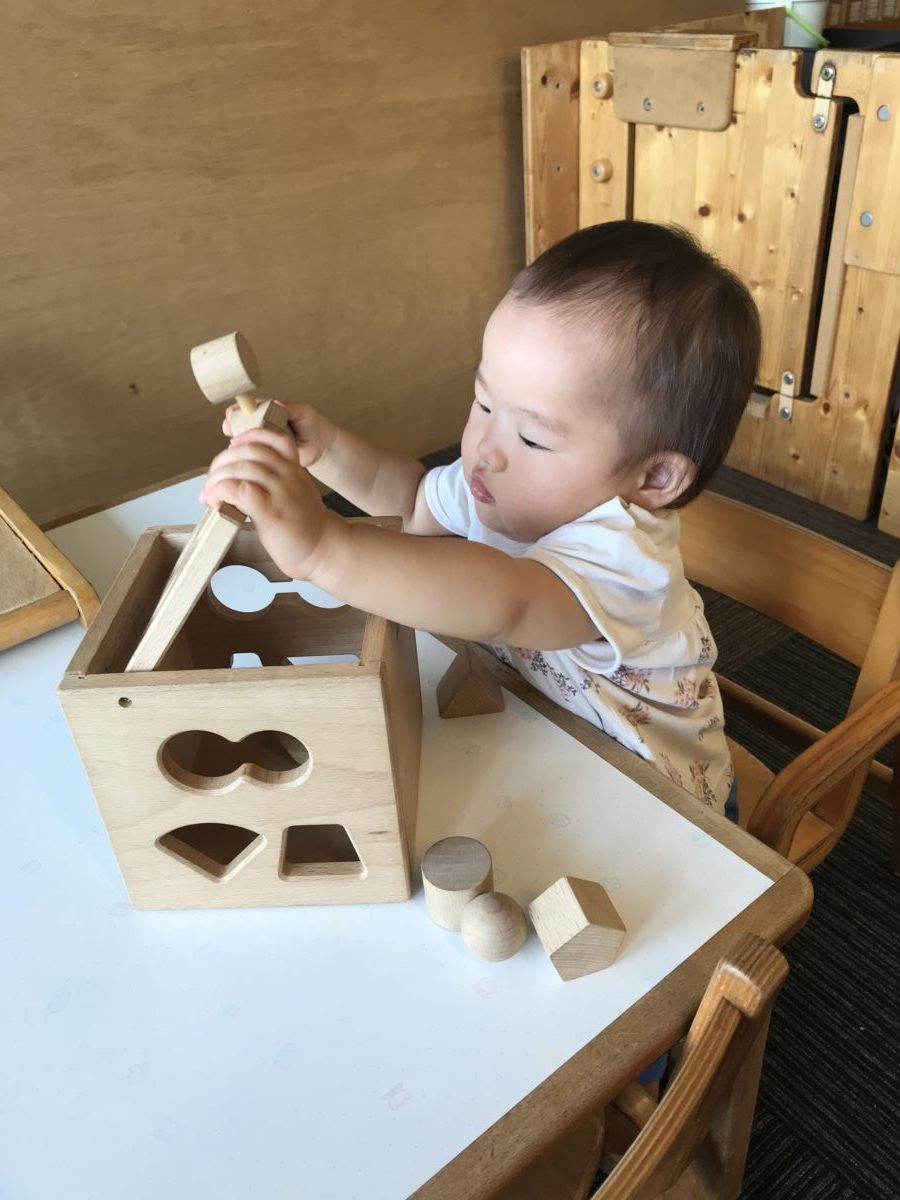すいか組さんは手先の力がついてきたようで、木の箱のフタを片手で上手に持ち上げて積み木を全部中に入れたり取り出したりを繰り返し楽しんでいました。また、足腰の力や体幹もついてきてカートに掴まりながらゆっくり前に押して歩く姿もありました。