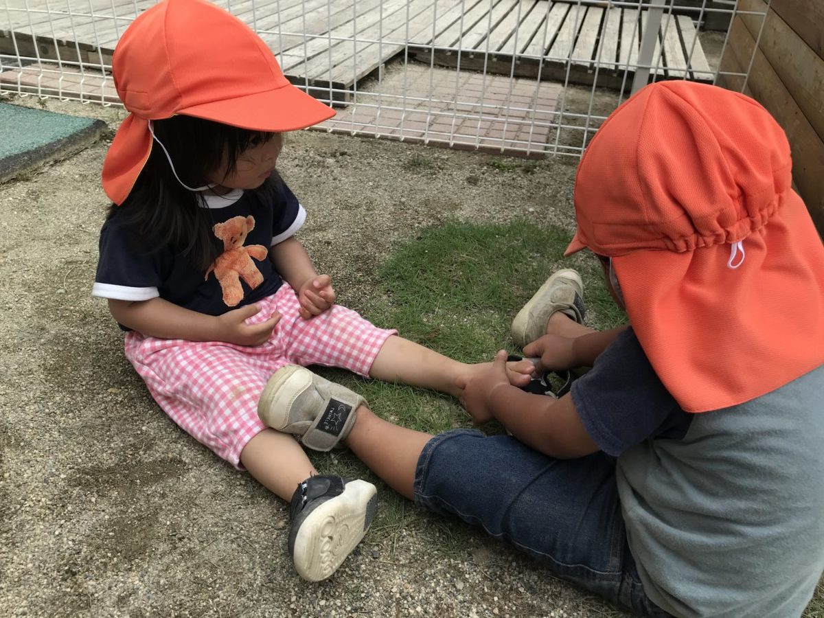 靴が脱げてしまったお友だちの靴を一生懸命履かせてあげようとする姿がありました。気付いてくれた気持ちが嬉しかったね。