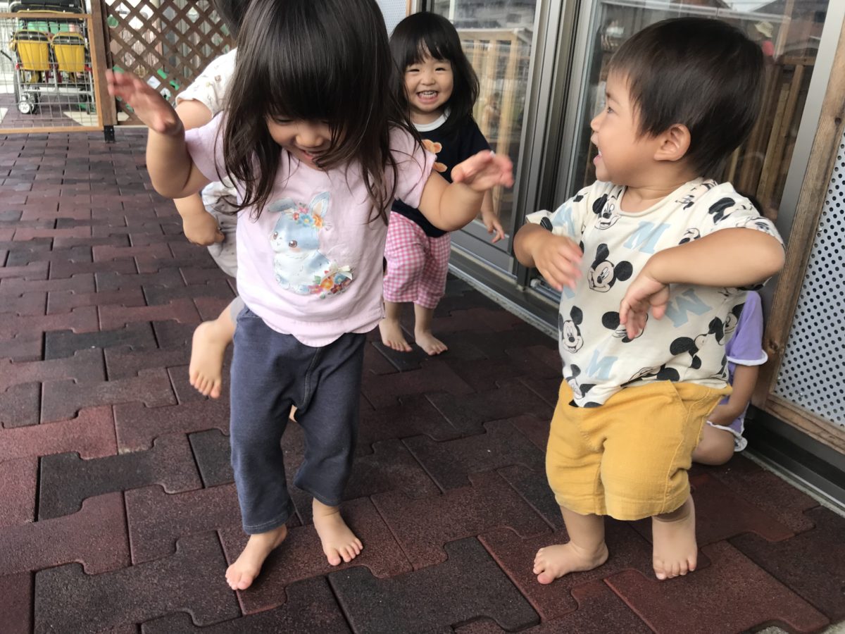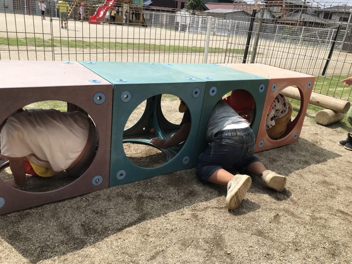 園庭ではカラーボックスをトンネルにしていろいろな場所から入ったり出たりとお友だちの姿を見て真似する姿がありましたよ。お友だちの姿にたくさん刺激を受けて成長していく姿が楽しみです。
