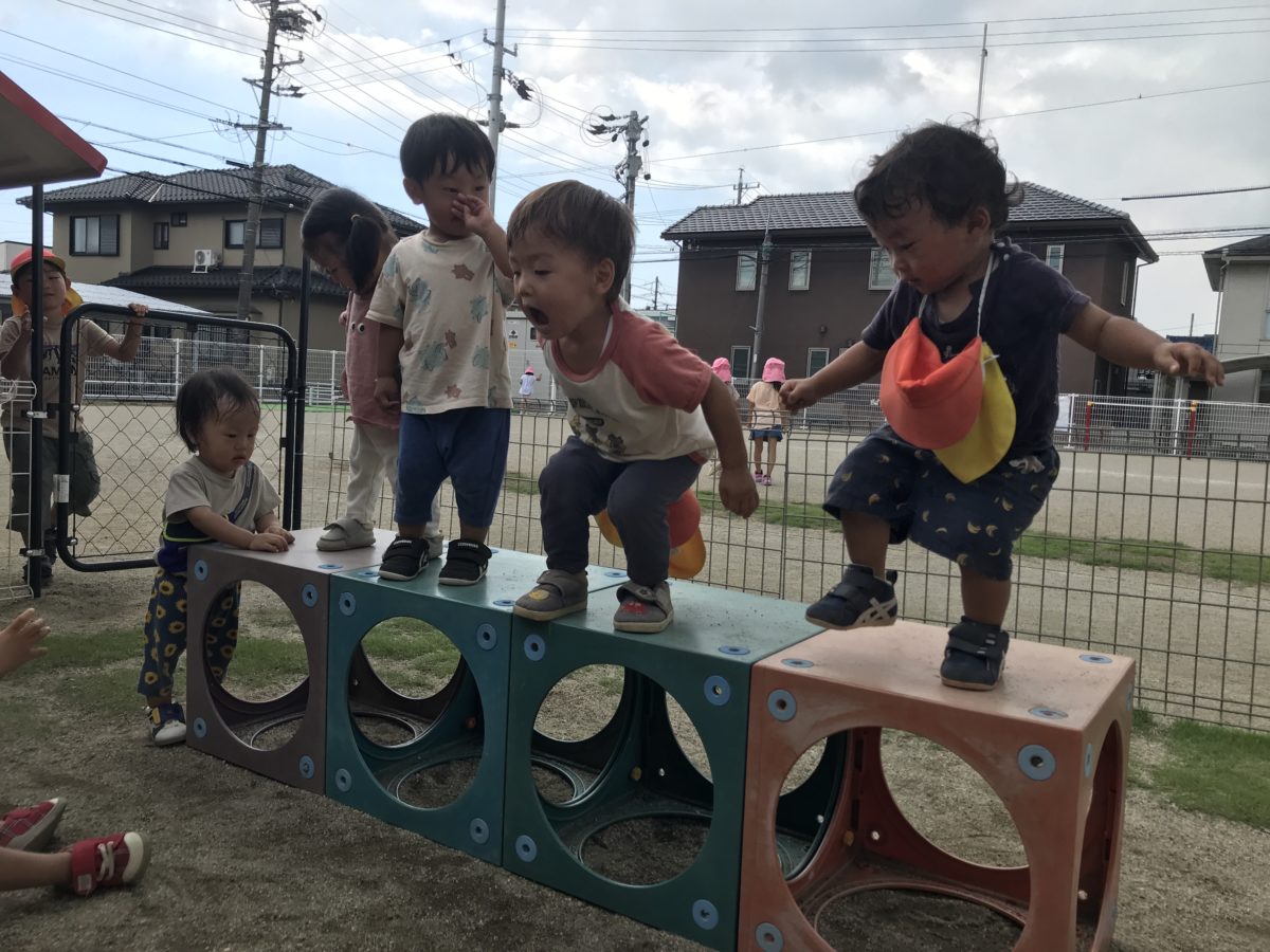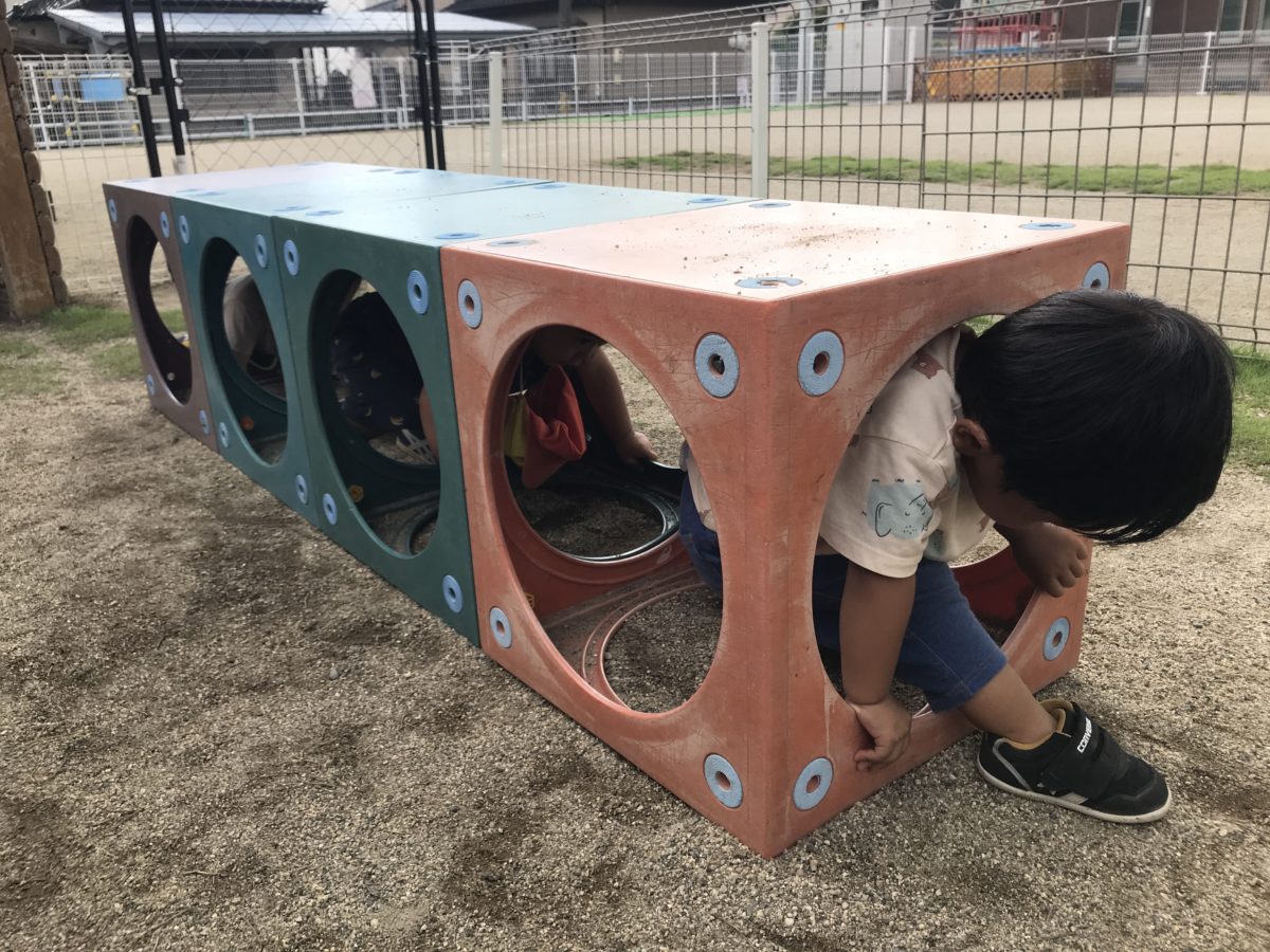 今日はカラーボックスでのトンネルをくぐったり、上に乗ってジャンプしたり、寝転んでみたりして、様々な方法で遊ぶ姿がありました。特にトンネルは昨日もしていたので、とてもすいすいくぐっていて、くぐっていく入口、出口も自分たちで決めているのか、同じところから入って出てまた入っての繰り返しをしていてとっても楽しそうに遊んでいました。トンネルくぐりが楽しかったのか、テラスに移動してからもトンネル遊び。自分の足を開いてトンネルを作って、お友だちに「ぐってー!」と言いながらくぐってほしいのをアピール!小さなトンネルにお友だちも楽しそうにくぐっていく姿がありました。