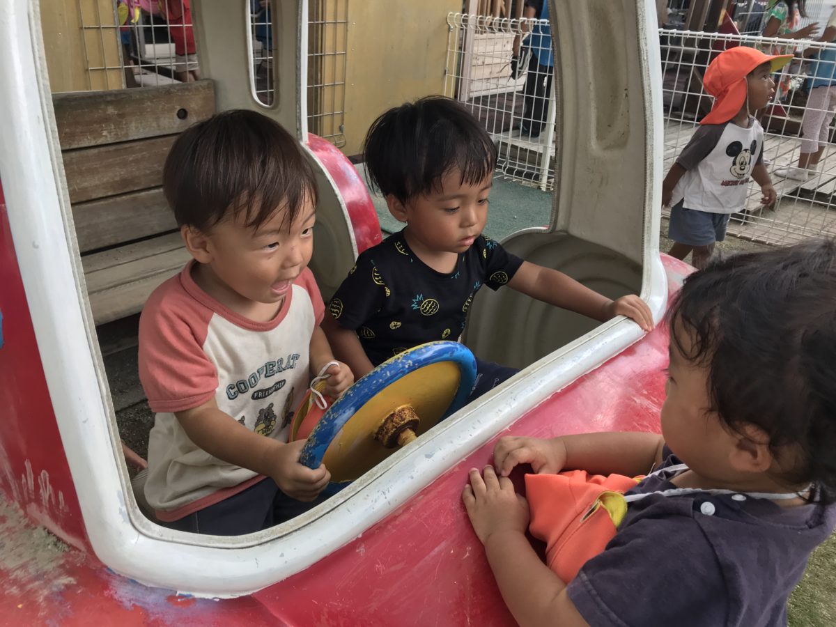 「どこいくのー?」「あー!」と車でお出かけするお友だちに話かけ、会話を楽しんでました。