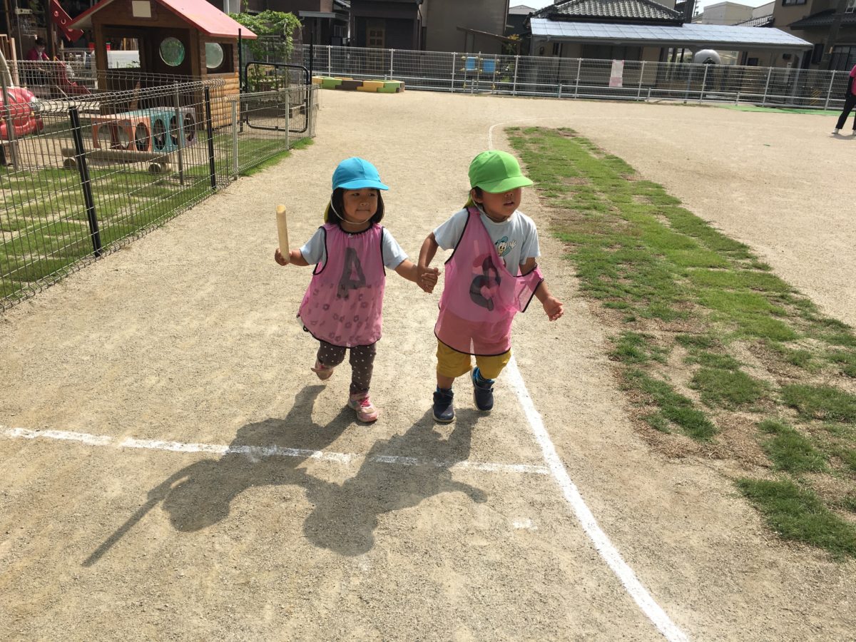 朝からさくらんぼのお友だちも「ビブスくばりたい!」とお友だちに配っていく姿がありました。少し前までは大きい子に配ってもらっていたのに、自分から配るようになったり、園庭でもりんご組さんが走るときに一緒に手をつないで走ろうとしたり「りんごぐみさんよんでくるわ!」と気が付いて呼びに行ってリレーに誘う姿も増えてきました。年下の子と一緒に過ごすようになり、少しずつお兄さんの気分も増してきているようです。またストライダーリレーでも勢いよくスピードに乗って進んでいくめろん組さん。きちんと安全第一での走行を心がけていて、スピードを途中で減速したり、足でしっかりブレーキをかける様子もありました。保育室では、以前やったペットボトルを使った実験を今日もやりたいと話す姿があり、準備すると「なぁなぁなんでさ、ペットボトルをみぎとひだりにふっただけなのに、みずがグルグルまわるのはなんで?」と不思議そうにペットボトルを見つめる子どもたち。子どもたちは1つの実験からも不思議に感じることがあり毎日違う発見が生まれています。