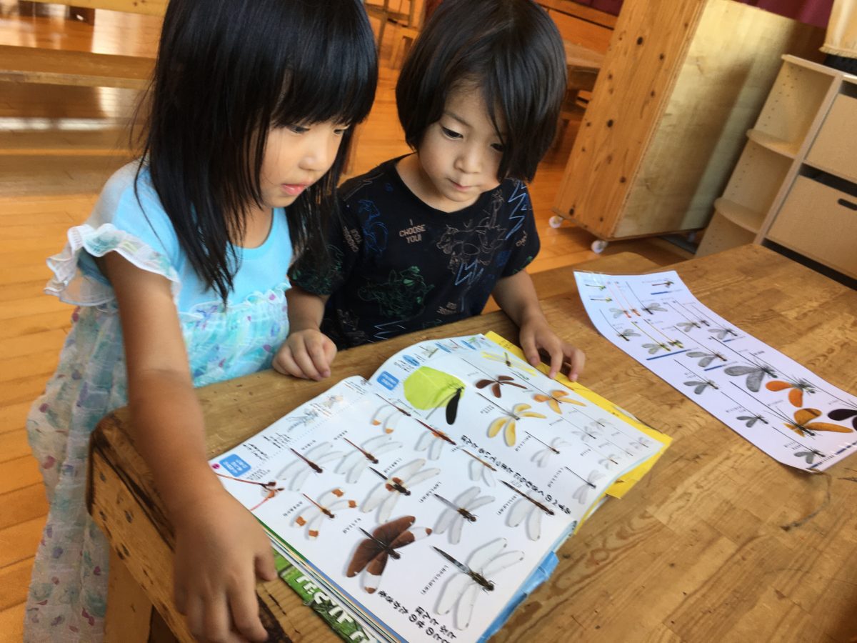 トンボの図鑑を見ながら、「このとんぼみたことあるー。」「オニヤンマ、かっこいいな。つかまえてみたいなぁ!」と盛り上がる様子がありました。
