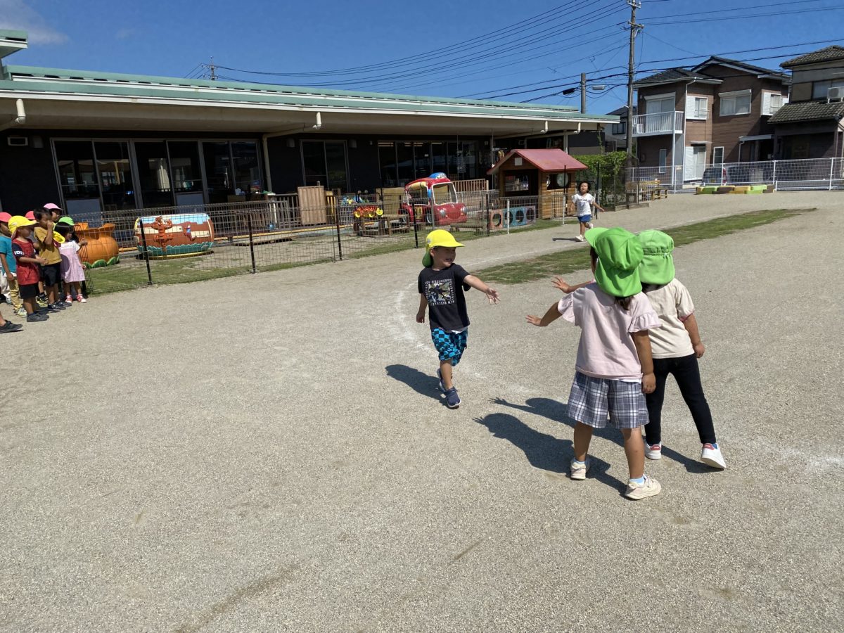 午後からのリレーではもっともっと速く走りたい!!一人2周走りたい!というお友だちが集まって、盛りあがっています。最近ではそんなめろん組さん、ばなな組さんに憧れてさくらんぼ組さんも二周のリレーに挑戦する素敵な姿が見られます。