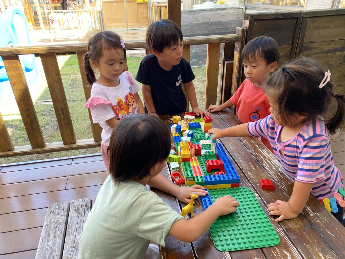 りんご組さんが大きい組さんが作ったブロックのお家でごっこ遊びを楽しみながら、かわいい会話がはずんでいました。
