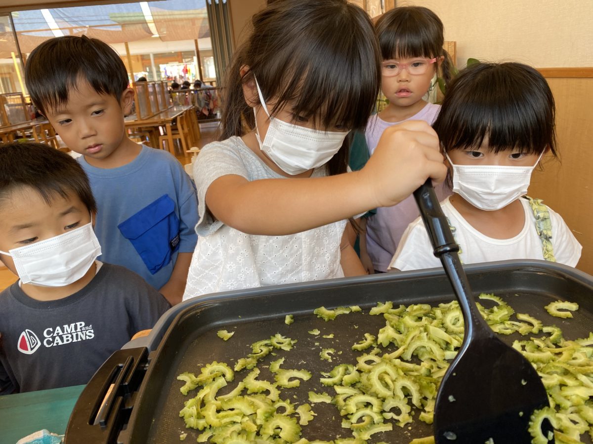 連休の間に園庭の畑のゴーヤがすくすく育ち、横に大きくなったもの、色がオレンジ色に変化したものなど成長が見られました。今が食べ時!!のものを「これ、いいんじゃない?」とお友だちと収穫しながら、「これ、あなあいとるよ!」「くろくなっとる!」と謎の穴が開いていたり、「いろ、めちゃかわっとるー!!」と色がオレンジ色に変化しているものも発見し、中の様子を観察していました。外見は黄緑だけど色が薄くなってきているものもあり中を覗いてみると・・・・「わたがない!!」「オレンジ!!」と中と外の色の違い、外側よりも中側の方の変化が早いことに気付いて驚きの声が上がっていました。オレンジ色になるとわたがなくなってしまうこと、タネが大きくなることに驚き、その変化のスピードの速さにも不思議を感じているようでした。クッキングでは「しょうゆ味にしたい!」「このまえの‘のり‘、おいしかったよな!?」としょうゆ・のりの味つけでゴーヤを炒めました。味付けの前だけの焼いている香り、しょうゆ・のりの香りの違いに気付いて「もう、においだけでおいしそう!!」「おすしやさんのにおい!!」と話していました。