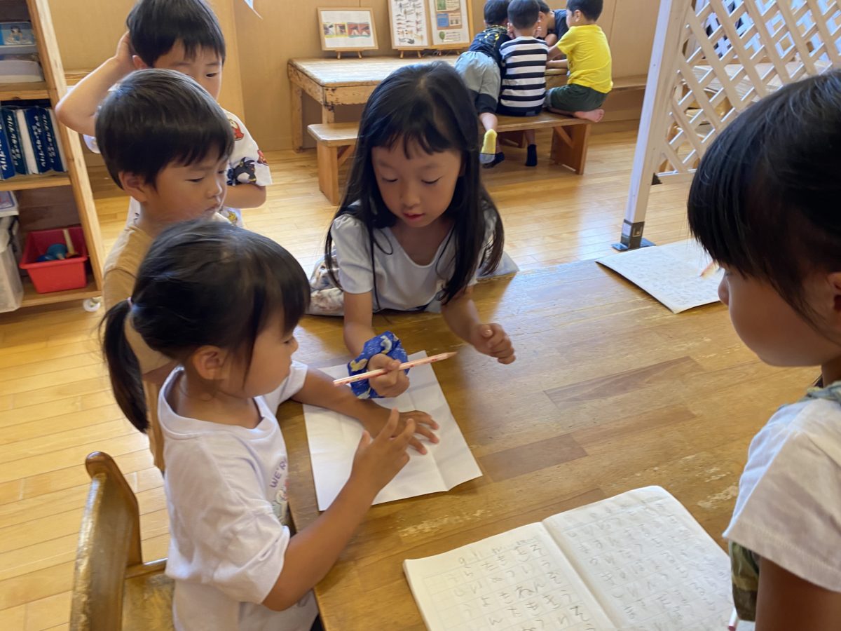 めろん組さんが文字を書いてる横で興味津々に覗き込むさくらんぼ組さんに「えんぴつでかいてみる?」「もてる?」と優しくアドバイスする姿がありました。