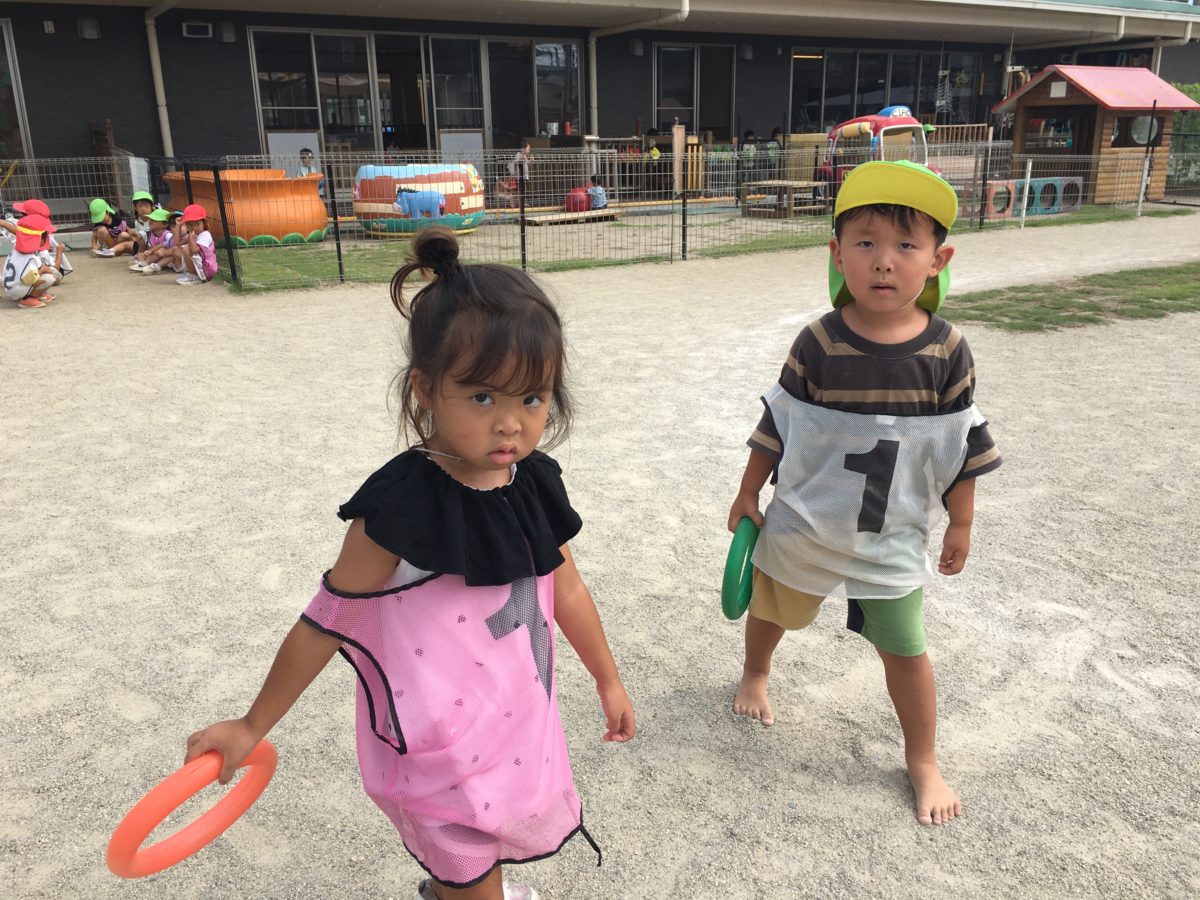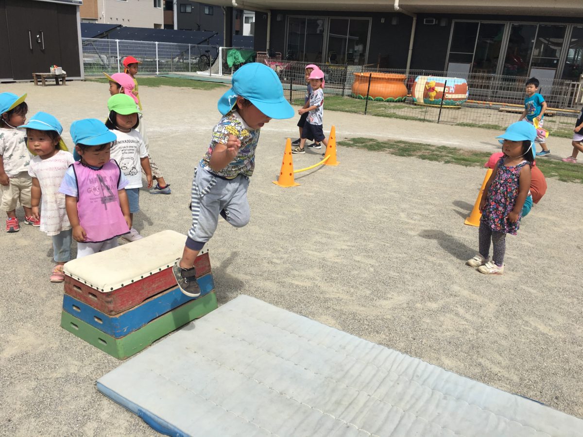 ペットボトルで作る渦から子どもたちが「もっとグルグル(渦)がみえるほうほうないんかな?」と話す姿があったため、今日は違う実験をしていました。「なになに?ペットボトルが2ほんになってる!なにができるんだろう?」と子どもたちも興味津々な様子。そして、試しにやってみると「わーここがぐるぐるしてる。」「まえのうずよりもみやすい。」「もう1かいやりたい」とペットボトルをひっくり返してまわしてみると「あっ!こっちのがうずができている。」とペットボトルな形や分厚さでもできやすさが違うことを発見したようでした。また、園庭ではハードルや跳び箱を使って運動遊びを楽しみました。りんご組のお友だちもハードルや跳び箱の上からジャンプを楽しみました。「かっこよくじゃんぷするでみとってな!」と話す子どもたちの姿もありました。はじめは少し恐る恐るジャンプをしていた子もだんだんと怖さもなくなってきたのか大ジャンプを見せながら楽しんでいました。