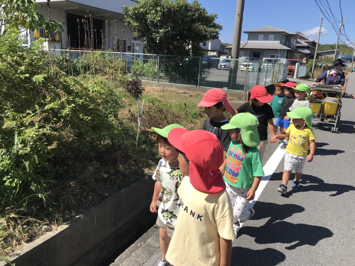 小さい組さんと一緒に園周辺のお散歩に出かけました。「ここ、しっとる!」「まえ、きたよね!」少し久しぶりのお散歩に手をつないだお友だちとの会話がはずんでいました。