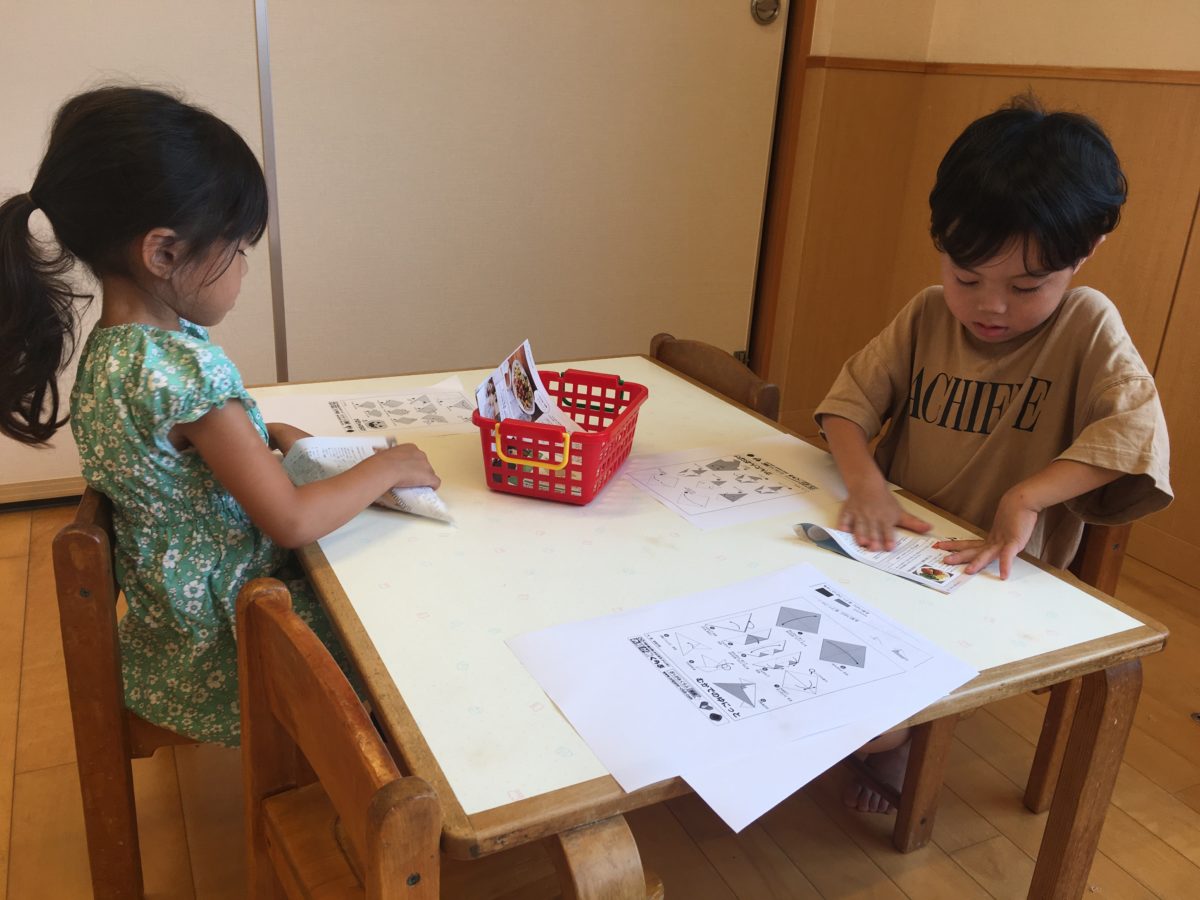 折り紙では、ハロウィンも近づき、子どもたちの会話からもハロウィンの話が聞こえてくることもあり、いろんなおばけの図を用意しました。すると、「おぉおばけがいっぱい!」「はろうぃんやでかな?つくってみたい」と図を見ながらおばけづくり。「これかんたんや~♪」「ここわからん、だれかおしえて!」とみんなで協力しながら折り紙遊びも楽しむ姿もたくさん見られました。