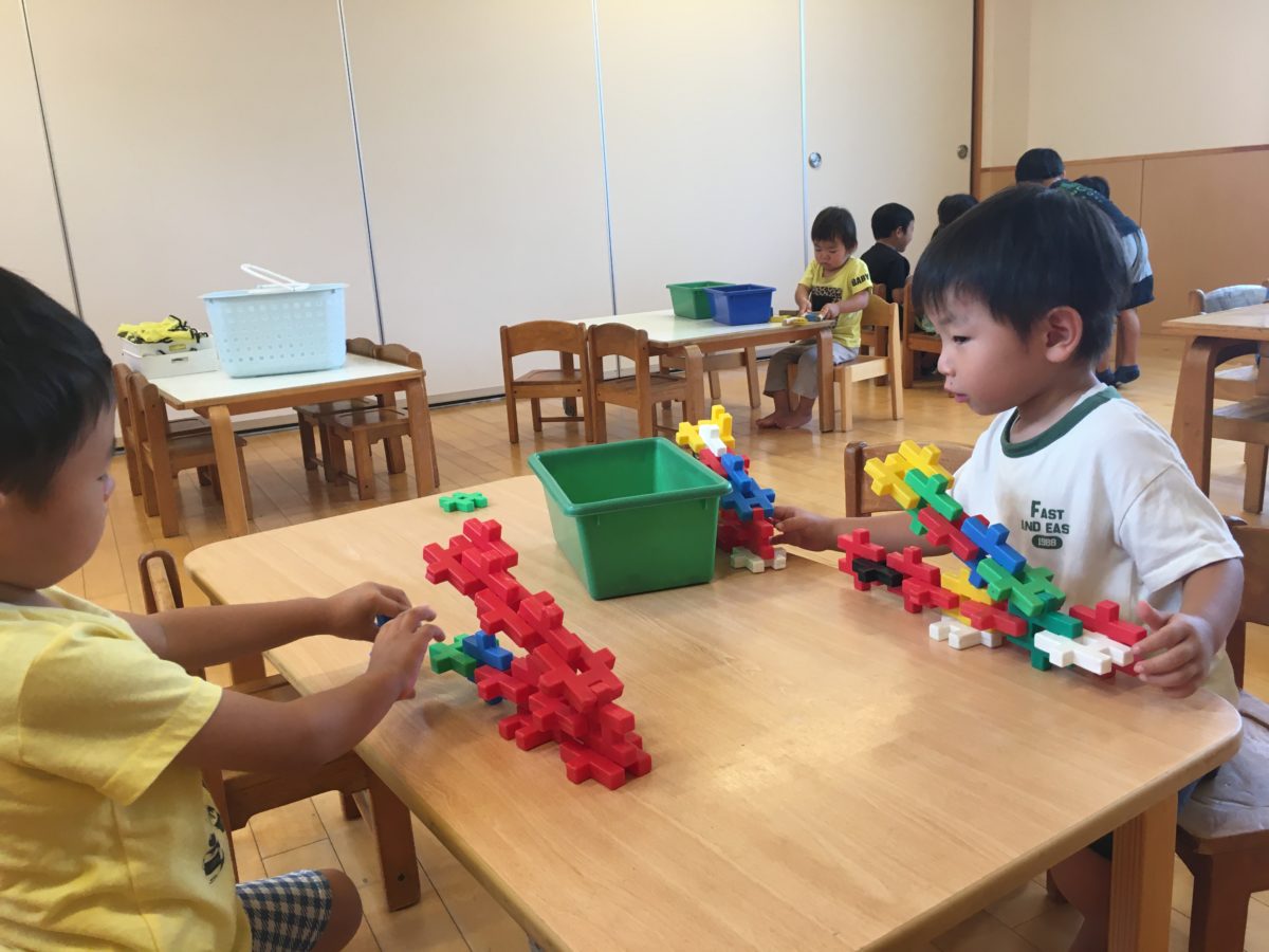 「みてー!はしごしゃつくったの~。」と話して見せていると「いいなーかっこいいなぉ。ぼくにもつくって~♪」とお願いしていました。