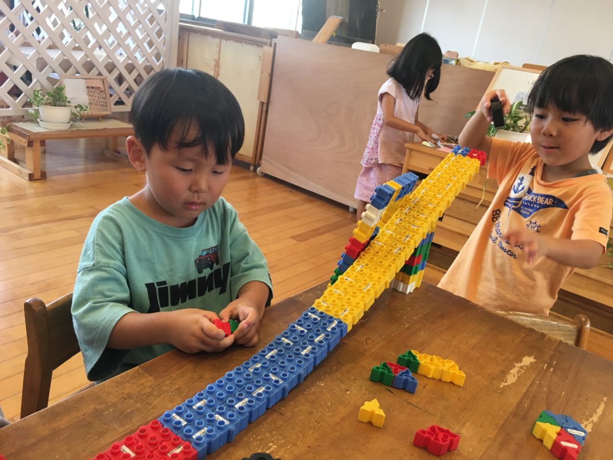 「これもっとたかくしたいなぁ~!!」とりんご組のお友だち。「2ばんめくらいにしてみるー?」とどの高さにしようかお友だちと相談中。「このたかさやってみたい!!」と今までの高さよりも高めにしてみました。「とんでみよー!」といざ跳んでみようとするとブレーキ!!「ちょっとこわいー!」と思ったよりも高かったようでした。しかし、そこはあきらめる様子はなくゆっくりまたいでみると「わーいやったできた!」と嬉しそうなりんご組さんでした。そしてお部屋では、「これやるー!」と掲示してあった実験に興味を示しためろん組さん。「かみをいろぬるんや。わたしはまーかーでやってみる!」「わたしはいろえんぴつだったらどうなるかやってみたい。」とそれぞれのアイテムを使って色を塗っていきました。そして、午後から子どもたちが塗ったものを水へつけてみると…「なんかじわじわとおみずがあがってきているきがする!」「ほんとやーぴんくがここまできた!わーきれい!」と少しずつ色づいていく紙の様子が面白かったようで子どもたちはくぎ付けな様子でした。そして、最後までいき水を紙から出すと「えー!なんか ぬったほうようよりも、ぬってなかったほうのがいろがこい!」「なんでなんで?ふしぎやん。おもしろい。」「みてー!おみずもさ、いろがついたけど、いっしょのようにぬったのに、ひだりのみずのがいろがこいね。」と1つの実験からもいろんな不思議が発見できたようでした。