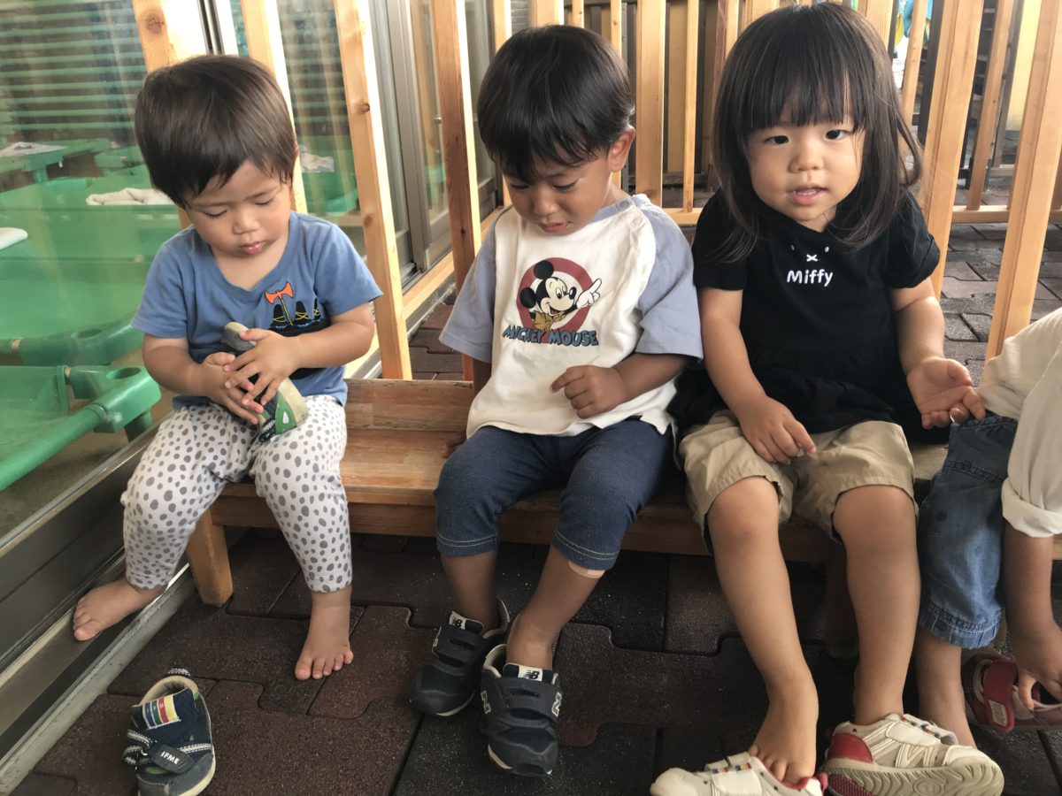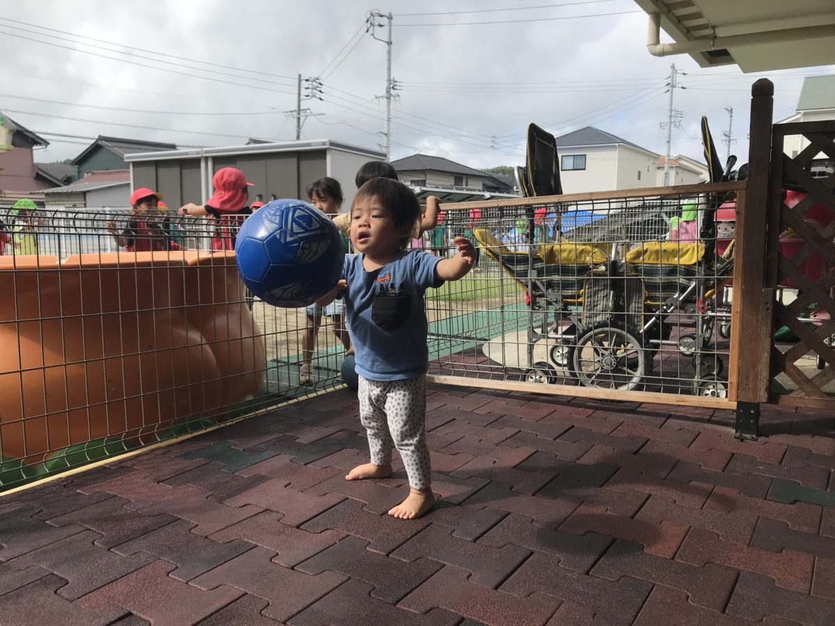 テラスではボール遊びをしました。以前に遠くに飛ばしていて楽しそうにしているのを見ていた子たちも、ぐっとボールを持って構えたかと思うと、遠くに飛ばそうと体全体を使ってボールを飛ばす姿があり、遠くに飛んでいくボールを見送って「でーたね!」と遠くに飛んでいったことを言葉にして喜ぶ姿がありました。お友だちがどうやってして遠くに飛ばしているのかを近くで見ていたので、ぐっと持った後に飛ばす方法を真似ながら、何回も遠くに飛ばして楽しんでいました。