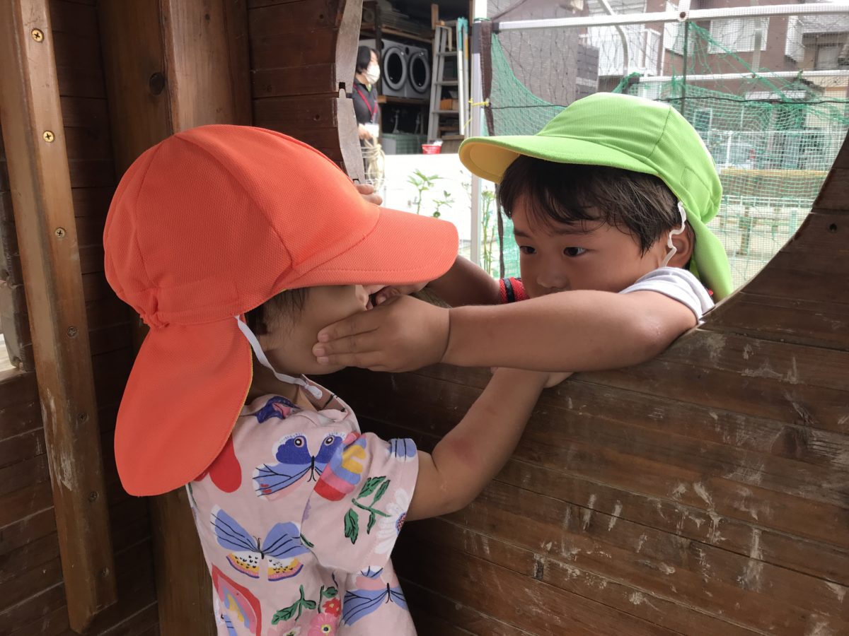 今日はお外で遊びました。車の遊具で遊ぶ子が多く、ハンドルをグルグル凄い勢いで回していたり、手を振りながら優雅に運転楽しむ子がいたり、様々な楽しみ方をする子が居ました。助手席に乗っている子も楽しそうで、運転を変わりたくて、「かーわってー!」と言っていたり、お買い物ごっこをしているのか、「スーパーいこ!スーパー!」「おかしおかし!」とスーパーに向かう車の中での会話をして楽しんでいる子がいて、車の遊具での会話が楽しそうでした。