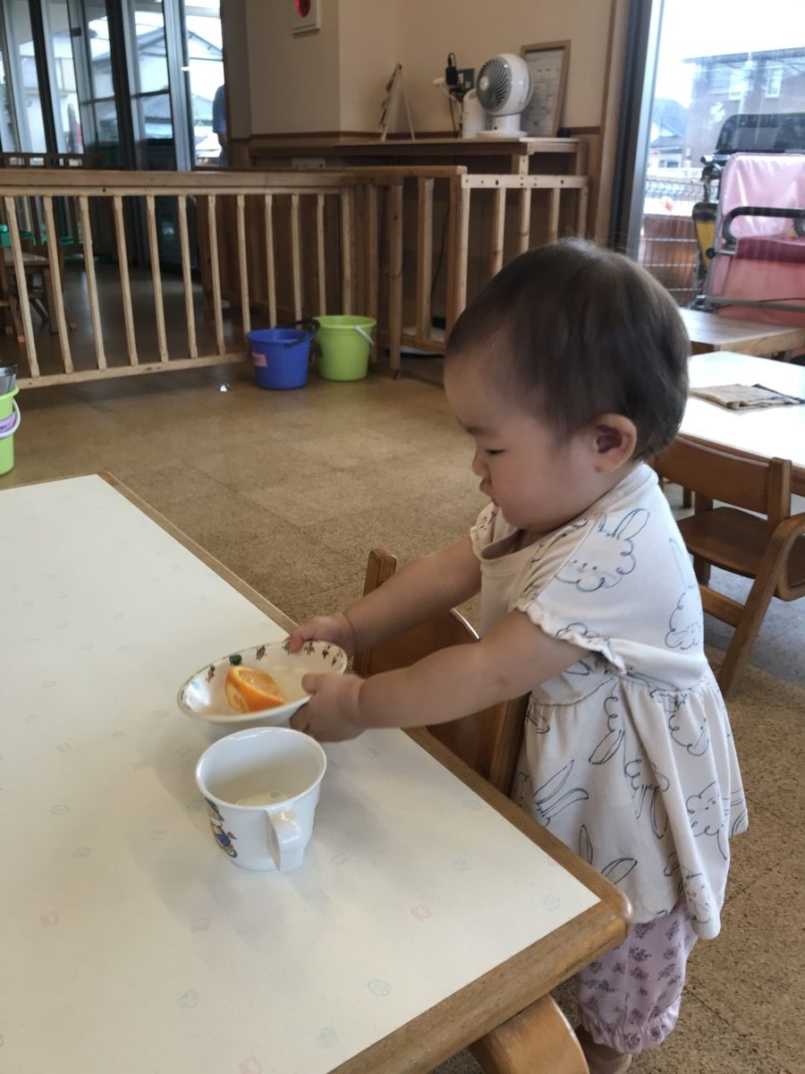 すいか組のお友だちも今日は自分でおやつを運んで食べている姿がありました。慎重に慎重に落とさないように気を付けながら運び、席まで運ぶと自分で椅子を引いて座って食べる姿がありました。自分で運んだからか少し満足そうに食べていました。