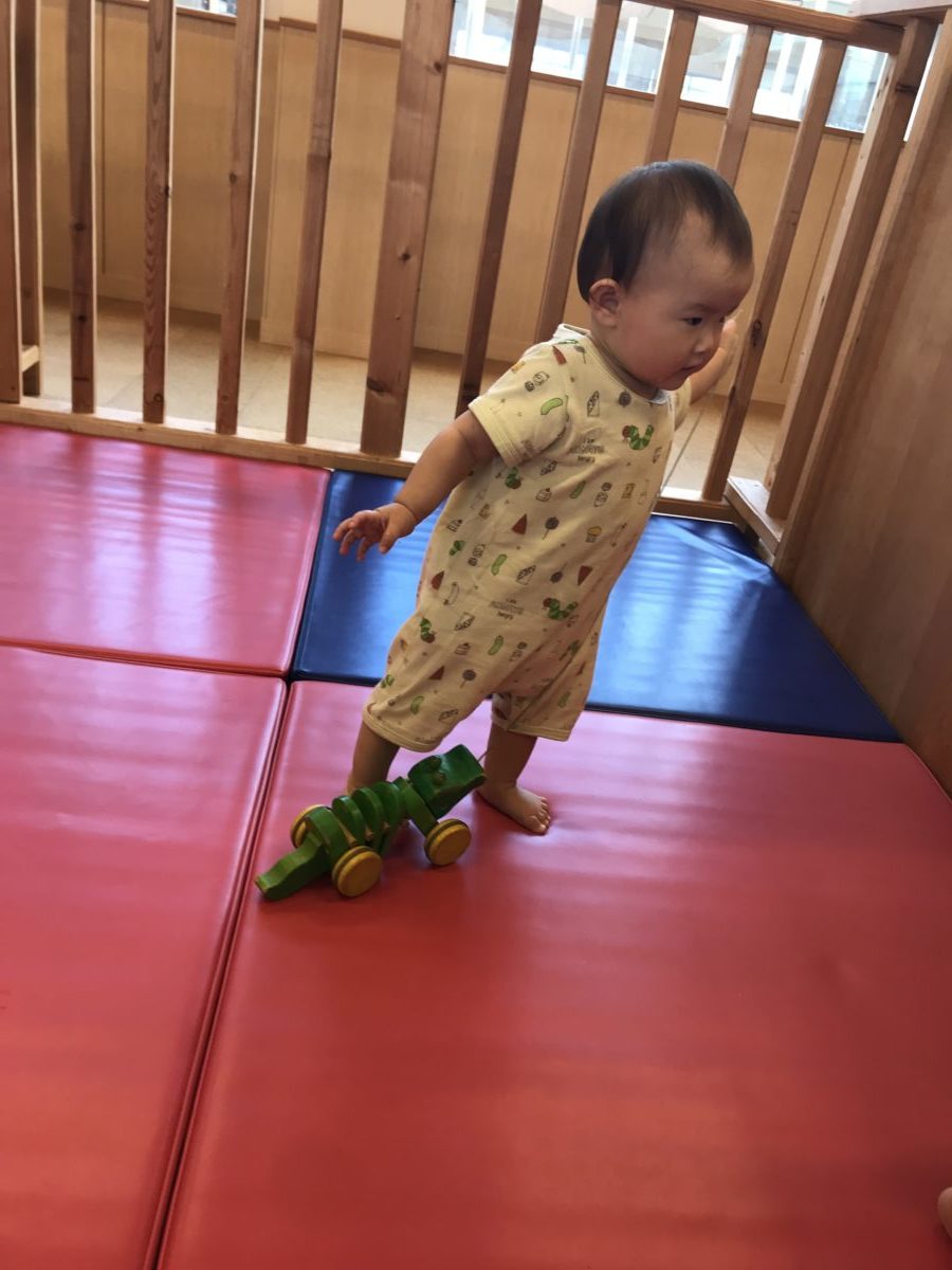 カラカラカラ~動くと音が鳴るのが面白いようでお部屋の中を歩いて楽しんでいました。