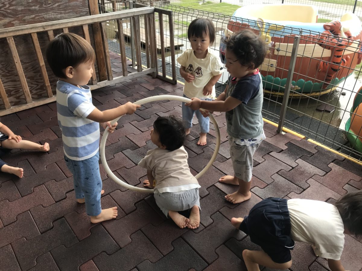 フラフープをトンネルのように持って「はい!くぐって~!」と輪っかの中を指差して教えていました。何度もくぐっていたお友だちも今度は持ちたかったようで、両側から持って「どうぞ~」と嬉しそうに見守っていました。