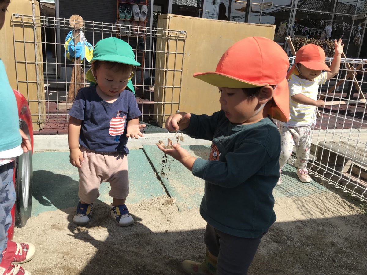 砂を手の平にサラサラと落とし、少しずつこぼれるのが面白いようで繰り返し遊んでいました。