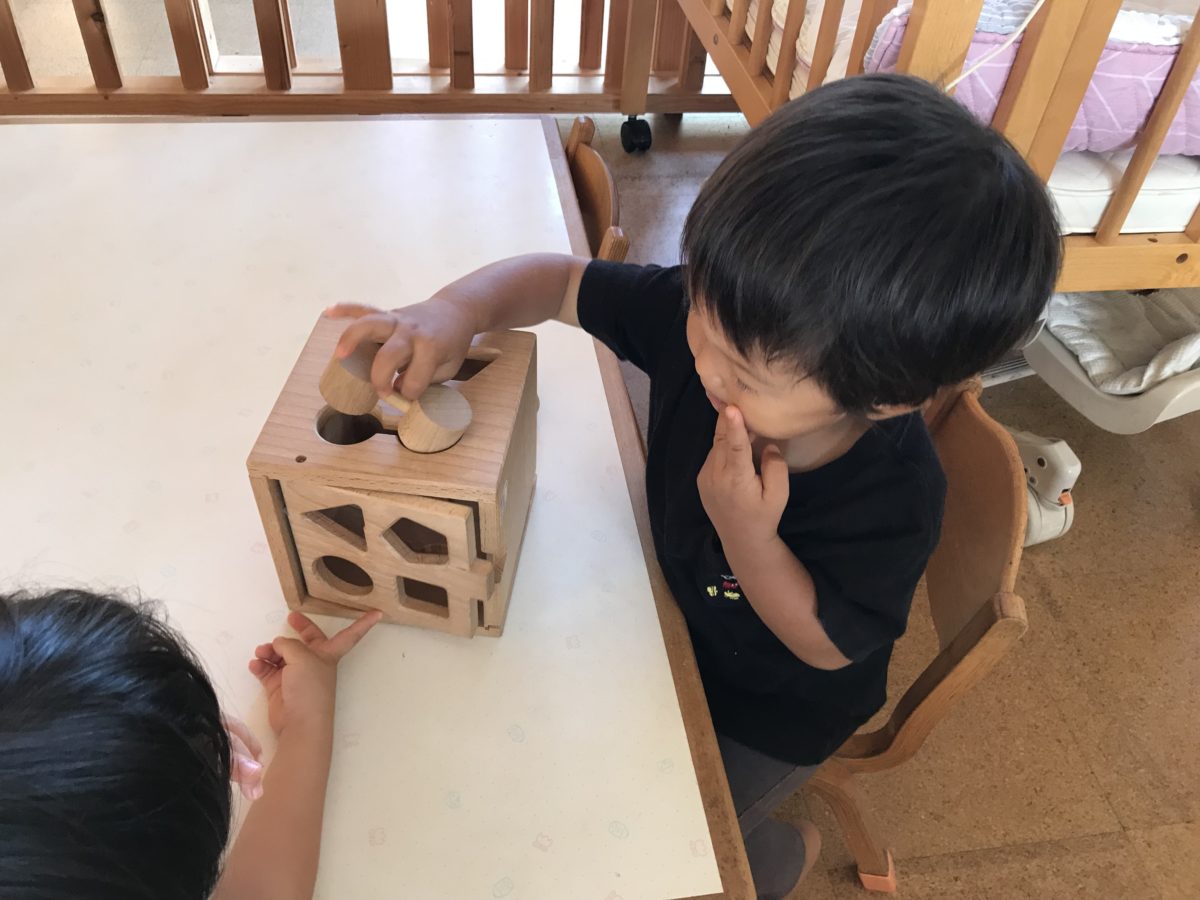 同じ形はどこかな‥カタン、と箱の中に入るとお友だちと手を叩いて嬉しそうにしていました。