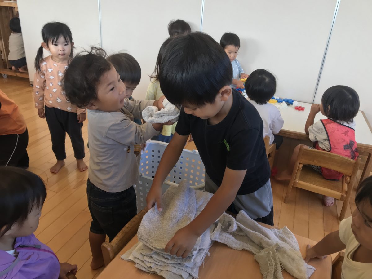 めろん組のお兄さんの雑巾を畳むお手伝いをしてくれました。上手に畳めたね。
