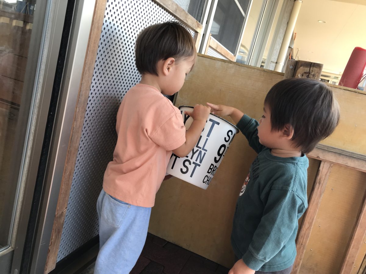 園庭に出ると、2段に積んだカラーボックスに登り、得意げな顔で以上児のお友だちに手を振る姿がありました。少し前まで恐る恐る登っていたのですが、成長した姿が頼もしく思いました。すいか組のお友達が遊びに来ると、「かわいいー」と言いながら近寄り、鼻水が出ているのに気づき、さっとテッシュを取りに行って拭いてあげる優しい様子も見られました。また、ごみ箱を取りに行き、捨てに行ってあげる等いちご組さんの連携のとれた姿も見られました。カラーボックスに登って遊んでいるお友だちが遊びながら1人で何か言っているのでそっと聞いてみると、アンパンマンの歌を歌ったり、1んでお話をしながら楽しそうに活動をしていました。いろいろ想像を膨らませながら遊んでいるのでしょうね