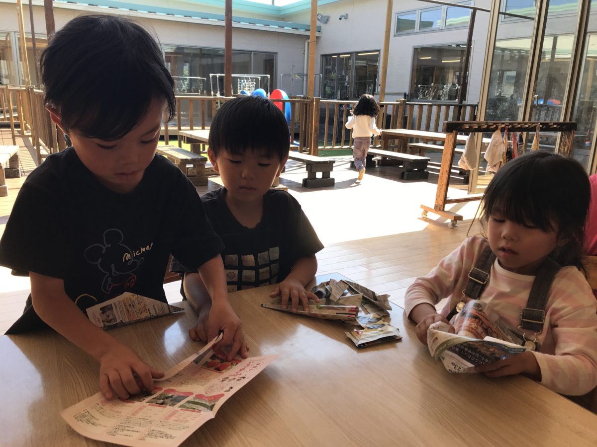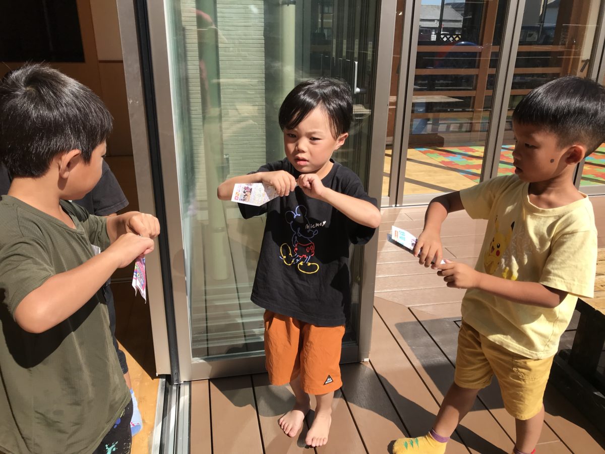今日はお手伝いをたくさんしてくれた子どもたち。洗濯を畳んでいると「やりたーい!」と言って畳んだ後にロッカーに入れる作業を手伝ってくれたり、ビブスを畳んだりしました。アルバイト料は折り紙。そこから各々に好きなものを作っていました。紙飛行機を作ったお友だち。作りながら「後で飛ばして勝負しよう!」「いいよ!」と言いながら作り、テラスで飛ばして遊びました。「こっちのが遠くに飛ぶで!」「違うでー!僕のが飛ぶでー!」と何回か競って、あまり飛ばないことが分かると、「世界一飛ぶ飛行機作りたい!」と言う姿が。世界一飛ぶ紙飛行機でインターネットで検索するとギネス世界一の紙飛行機が出てきました。「かっこいいー!」「作りたい!」「紙が長い!」と言うので、長方形の紙を準備しました。みんなで折り方を見ながら、「これなら簡単!覚えた!」「できた!完成!」「勝負しよう!」と出来上がった折り紙をテラスで飛ばしました。「すっげー!めっちゃ飛ぶ!」「みて!あんなところまで飛んだ!」と大盛り上がり!それを見ていた他のお友だちも「つくりたーい!」と言うのを聞いて「つくったろー!」と言いながらみんなに世界一の飛行機の作り方を教えてあげる姿があり、その後はみんなで飛ばしていてとても楽しそうに飛行機を飛ばしてました。「上向いて飛ばすと上にいくで!おもしろい!」と上に向かって飛ばすと上に飛んでいき面白いと言って飛ばしたりして、様々な飛ばし方も楽しんでました。