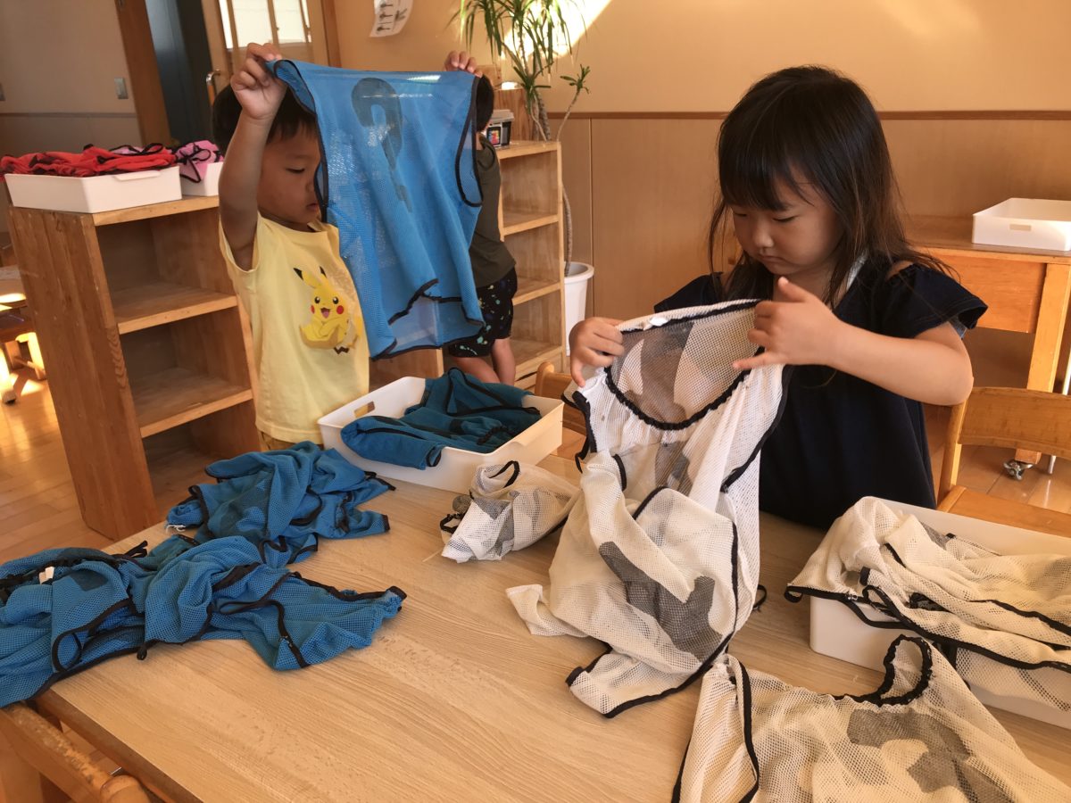 アルバイトでビブスを一緒に畳んでくれました。アルバイト料金は折り紙三枚。張り切ってお手伝いをしてくれました。