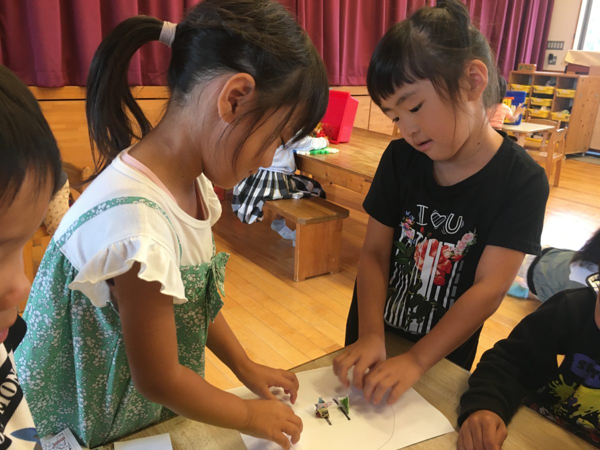 めろん・りんごチームVSばなな・さくらんぼ組対決!!りんご組さんも大きいめろん組さんと一緒に出来ることで嬉しそうな表情もあったり、一生懸命ついていこうとする姿が見られました。めろん組さんもかわいらしいりんご組さんの姿を見ながらゆっくり走ってスピードを合わせる優しい姿なども見られました。そしてリレーはばなな・さくらんぼ組さんの勝ちでした。その後にはめろん組VSばなな組さんの真剣勝負リレー!!いい勝負でしたが負けられない意地もあっためろん組さん。先にゴールしたのはやっぱりめろん組さんでしたが、ばなな組さんも「くそー!かちたかったー!くやしい」と悔しさを感じる子どもたちの姿もありました。お部屋では、りんご組さんは木のパズルに夢中な様子。みんなで1つのパズルを完成させようとして「それはここじゃない?」と置く場所を一緒に考えながら楽しむ姿がありました。そして紙相撲を小さな折り紙で作っていためろん組さん。「こんなちいさいのできたー」「これでたいけつしてみよう」と器用につくった小さなお相撲さんを使って対決をする子どもたち。「ちいさいのはつよいのかな?どうなるかな?」と言いながらトントン叩いて進ませ、同じタイミングでお相撲さんが倒れ、「きょうはどうてんやったな!もう1かいやる?」ともう1回楽しんでいたり、「ちいさくてかわいらしいからのこしておこう!」と大切にする姿もありました。