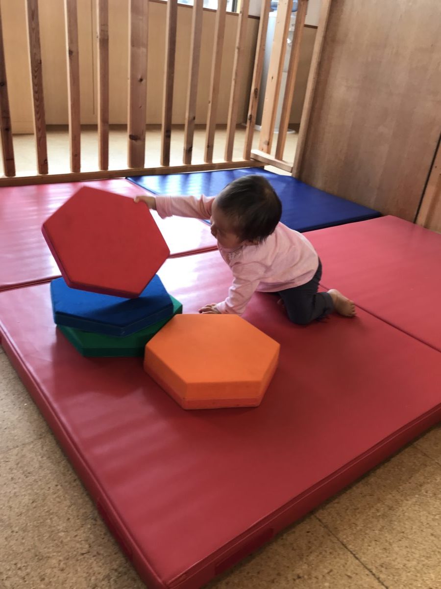 すいか組さんに大きなブロックに興味津々!片手では持てないなぁ…。積んでみたりして大きなブロックで遊びました。